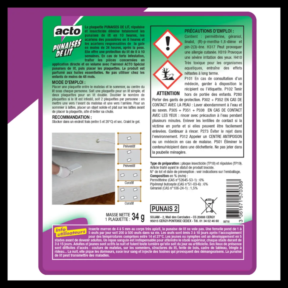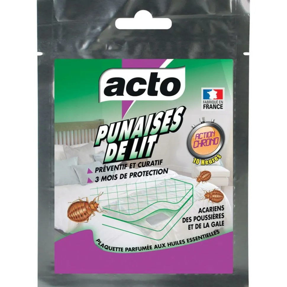 La plaquette ACTO pour punaises de lit est une solution répulsive et insecticide rapide et efficace. Elle élimine totalement les punaises de lit en moins de 10 heures, les acariens des poussières en 8 heures et les acariens de la gale en moins de 24 heures après la pose.Avec une protection qui dure de 8 à 10 semaines, la plaquette ACTO offre une solution durable pour garder votre lit sans parasites. Pour les cas de forte infestation, utilisez l’aérosol ACTO Spécial punaises de lit avant de placer les plaquettes.Enrichie d’un parfum agréable aux huiles essentielles, la plaquette ACTO non seulement élimine les nuisibles, mais aussi rafraîchit votre lit. Placez simplement une plaquette entre le matelas et le sommier, et l’effet biocide commence au bout de 6 heures.Caractéristiques:Répulsive et insecticideÉlimine les punaises de lit en moins de 10 heuresEfficace contre les acariens de poussière et de gale en moins de 24 heuresProtection de 8 à 10 semainesParfumée aux huiles essentiellesDétails du Produit:Conditionnement: 1 plaquette en pochette avec un trou européenDimension plaquette: 10 cm x 12 cmDimension pochette: 13 cm x 19 cmComposition: Perméthrine (6%), Pipéronyl butoxyde (6%), Géraniol (1,5%)Précautions d’emploi: Ne pas utiliser chez les enfants de moins de 48 mois. Peut provoquer une allergie cutanée et une sévère irritation des yeux. Très toxique pour les organismes aquatiques, entraîne des effets néfastes à long terme.Utilisez les biocides avec précaution. Avant toute utilisation, lisez l’étiquette et les informations concernant le produit. Produits dangereux : respectez les précautions d’emploi.