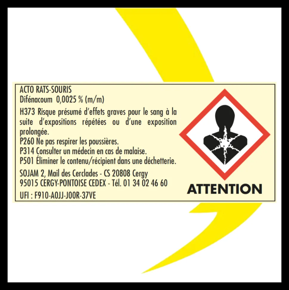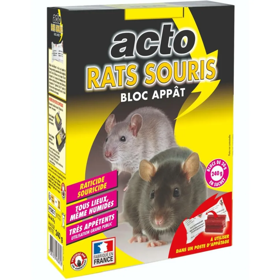 L’ACTO RATS – SOURIS Blocs appâts est conçu pour offrir une solution efficace contre les rats et les souris. Grâce à une formulation unique à base de céréales, liées par des graisses animale et végétale, ce produit attire facilement ces nuisibles. Le brodifacoum, un anticoagulant puissant, assure la mort des rongeurs par hémorragie interne en 4 à 10 jours, sans éveiller la méfiance des autres individus. Idéal pour les lieux humides comme les caves, sa composition hydrofuge lui permet de conserver son efficacité malgré l’humidité.Composition :Brodifacoum (CAS n° 56073-10-0) à 0,0012 % (m/m)Agent amérisantColorantHomologation : FANGA B + BLOC P – N° AMM FR-2017-0038 Rodenticide (TP14), appât en bloc (BB) prêt à l’emploi.Mode d’emploi :Utilisez dans des postes d’appâtage sécurisés.Dosage : 200g pour rats (intérieur/extérieur) et 40g pour souris (intérieur uniquement).Espacement des postes : 5-10m pour rats et 1-2m pour souris.Inspections régulières et rechargements au besoin.Suivez les instructions pour une application sécurisée.Conservation : Conserver dans un endroit frais, sec et bien ventilé, loin des enfants et animaux. Température maximale : 40°C.Utilisez les biocides avec précaution. Avant toute utilisation, lisez l’étiquette et les informations concernant le produit.
