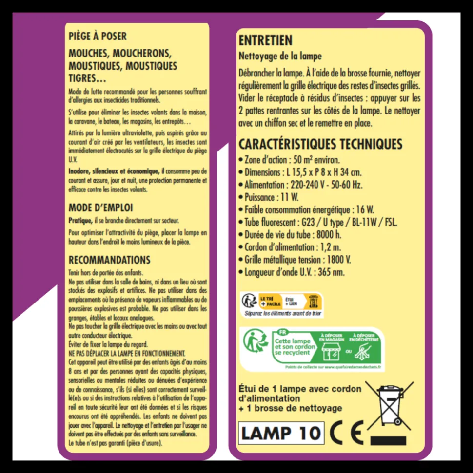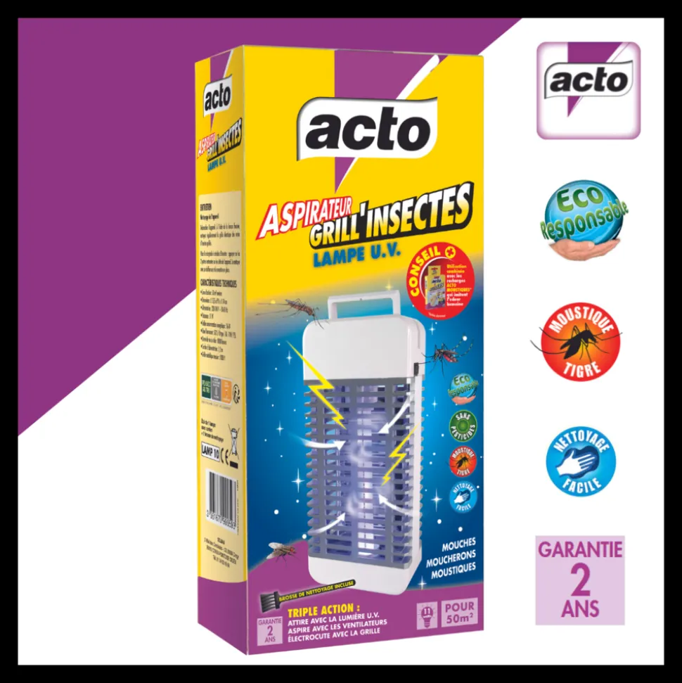Profitez d’un environnement sans insectes grâce à la lampe U.V. Grill’insectes avec Aspirateur ACTO. Ce dispositif moderne et efficace est un piège attractif pour tous les insectes volants, notamment les mouches, les moucherons et les moustiques, dont le moustique tigre.Un allié idéal pour votre bien-êtreCe piège à insectes est particulièrement recommandé pour les personnes souffrant d’allergies aux insecticides traditionnels. Fonctionnant silencieusement, inodore et économique, cette lampe assure une protection permanente contre les insectes, de jour comme de nuit.Comment ça marche?Attirés par la lumière violette émise par la lampe, les insectes sont aspirés par le ventilateur intégré et sont immédiatement électrocutés sur la grille électrique. Le piège U.V. est adapté à une utilisation intérieure ou sur des terrasses abritées.Mode d’emploiTrès pratique, la lampe se branche directement sur secteur. Pour optimiser l’attractivité du piège, il est recommandé de placer l’appareil en hauteur et dans l’endroit le moins lumineux de la pièce.Caractéristiques techniquesZone d’action : environ 50 m²Dimensions : L 15,5 x P 8 x H 34 cmAlimentation : 220-240 V 鈥énergétique : 16 WTube fluorescent : G23 / U type / BL- 11W / FSLDurée de vie du tube : 8000 heuresCordon d’alimentation : 1,2 mGrille métallique tension : 1800 VContenu de l’emballageChaque boîte contient une lampe avec cordon et une brosse de nettoyage.Précautions d’emploiIl est important de ne pas utiliser la lampe dans la salle de bains ou dans tout autre local humide. De plus, elle ne doit pas être utilisée dans un lieu où sont stockés des explosifs et artifices. Pour que la lampe reste attractive pour les insectes, elle ne doit pas être utilisée en plein jour à l’extérieur.SécuritéCet appareil peut être utilisé par des enfants âgés d’au moins 8 ans et par des personnes ayant des capacités physiques, sensorielles ou mentales réduites, à condition qu’elles soient correctement surveillées ou qu’elles aient reçu des instructions appropriées.