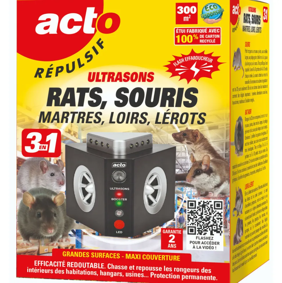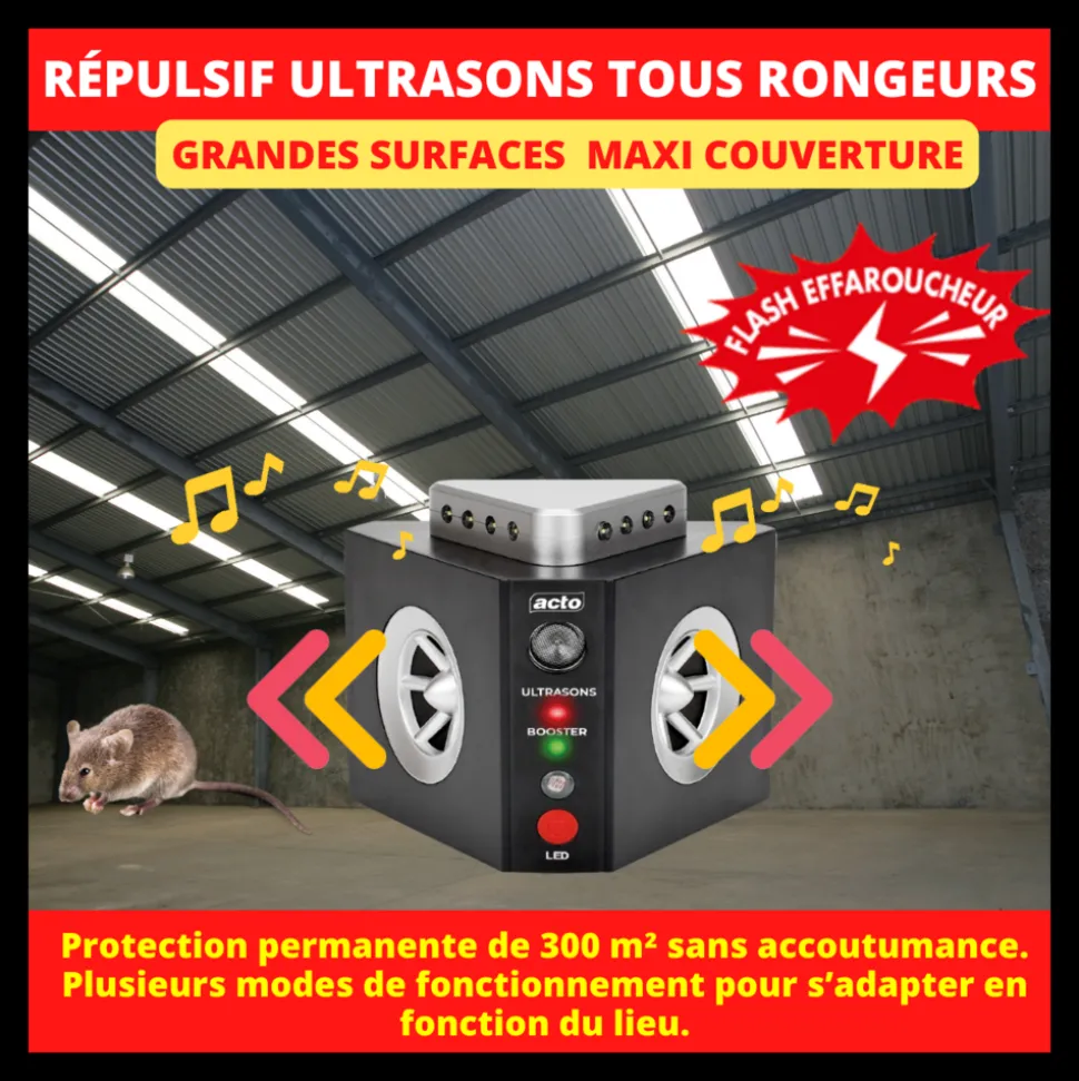 Le Répulsif à ULTRASONS FIXE est une avancée technologique innovante, conçue pour protéger votre maison, grenier, cave, hangars et usines contre les invasions de rongeurs indésirables tels que les rats, souris, martres, loirs et lérots. Cet appareil, qui porte la signature de qualité de SOJAM, est optimisé pour offrir une protection maximale sur une vaste superficie allant jusqu’à 300 m². Sa portée d’émission s’étend jusqu’à 20 mètres, garantissant ainsi que chaque recoin de votre espace soit préservé des nuisibles.L’innovation du répulsif réside dans son mécanisme 3-en-1. Il intègre :Deux haut-parleurs offrant une diffusion d’ultrasons sur un angle de 240°. Ces ultrasons émettent des signaux sinusoïdaux à fréquences variables, évitant ainsi que les rongeurs s’y habituent.Un booster avec un « Effet klaxon ultrasonique », calibré spécifiquement sur la fréquence la plus dérangeante pour les rongeurs. Cet effet est particulièrement puissant lorsqu’il est dirigé vers le point d’entrée des nuisibles.Un flash effaroucheur à 360° équipé de 12 LED. Ces LED fonctionnent de manière aléatoire grâce à un détecteur de luminosité. Lorsque l’obscurité s’installe, les flashs s’activent automatiquement et cessent au lever du jour.Mode d’EmploiL’utilisation du répulsif est un jeu d’enfant. Il suffit d’identifier la prise la mieux orientée vers l’entrée des rongeurs. Ensuite, branchez l’appareil sur une prise secteur de 220-240V et positionnez-le à une hauteur adaptée selon le type de rongeur 鈥écautions d’EmploiCet appareil est conçu pour une utilisation intérieure uniquement. Il est essentiel de ne pas l’utiliser en présence de rongeurs domestiques, tels que hamsters ou gerbilles, et de le tenir éloigné des enfants. Évitez également son utilisation dans les salles de bains ou à proximité d’explosifs. Pour optimiser son efficacité, veillez à ne pas le recouvrir ou le placer derrière un obstacle. Déplacez-le de temps en temps pour assurer une couverture optimale et pensez à installer des appareils supplémentaires dans d’autres pièces ou étages.Gardez la nourriture hors de portée et bloquez les entrées potentielles des nuisibles pour renforcer l’efficacité du répulsif. Bien que l’appareil soit simple à utiliser, il est essentiel de surveiller son utilisation par des enfants ou des individus nécessitant une attention particulière. Pour son entretien, suivez les instructions fournies et évitez de le laisser sans surveillance entre les mains des enfants.