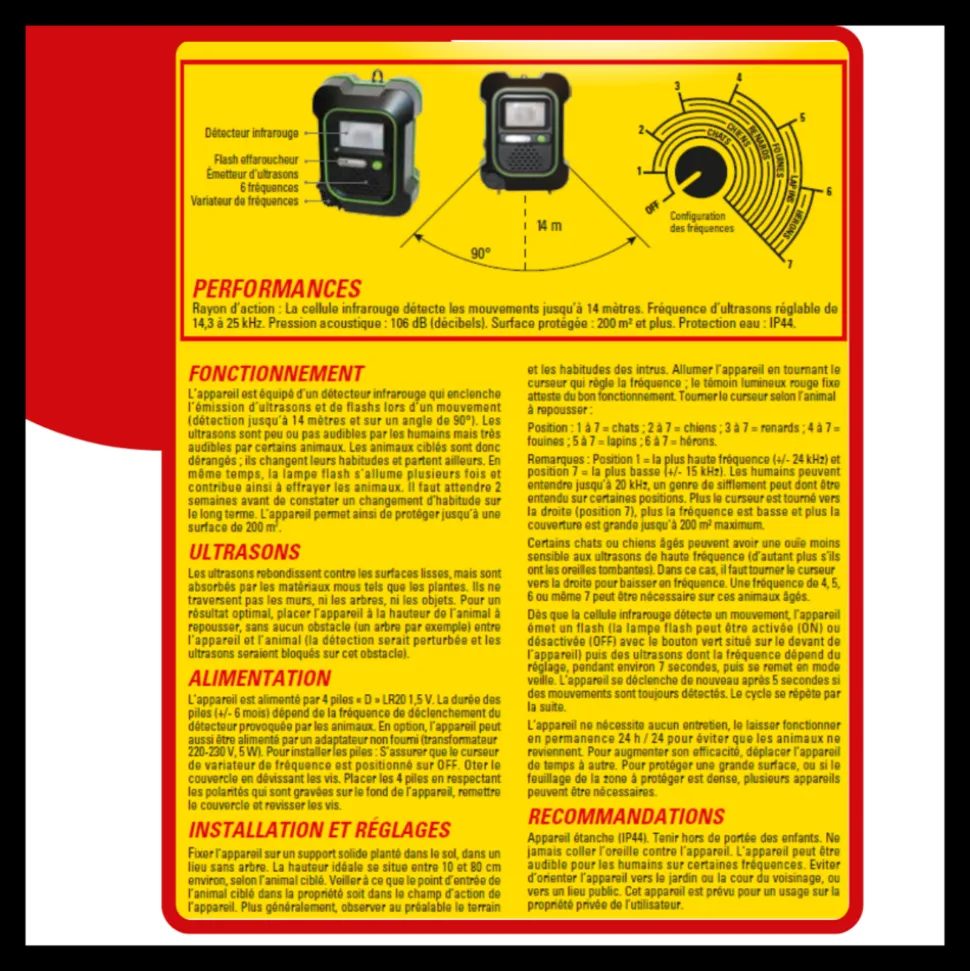 Venez découvrir le RETRO Répulsif Ultrasons, la solution idéale pour éloigner les animaux indésirables de votre propriété. Avec la capacité de repousser une variété d’animaux, cet appareil est une révolution pour ceux qui cherchent à protéger leurs espaces extérieurs contre les animaux errants ou sauvages. Efficace, durable et simple d’utilisation, cet appareil est la clé pour une tranquillité d’esprit totale.Description détailléeLe RETRO Répulsif Ultrasons a été spécifiquement conçu pour repousser une gamme d’animaux comprenant les chiens, les chats, les renards, les lapins, les fouines et même les hérons. Grâce à son émetteur d’ultrasons sophistiqué, qui opère sur différentes fréquences réglables, il fournit une solution non invasive pour garder votre propriété à l’abri des intrusions animales.L’une des principales caractéristiques de cet appareil est sa capacité à couvrir une large surface, allant de 200 à 250 m² en fonction des conditions d’utilisation. Ainsi, que vous ayez un petit jardin ou un vaste espace extérieur, le RETRO Répulsif Ultrasons est l’appareil qu’il vous faut.Pour ceux qui craignent les intempéries, soyez assuré que cet appareil a été conçu pour résister à la pluie avec une certification IP44.Mode d’emploiL’utilisation du RETRO Répulsif Ultrasons est assez simple. Avant de le mettre en marche, assurez-vous que l’interrupteur est en position OFF. Ouvrez ensuite le compartiment à piles situé à l’arrière et insérez les 4 piles LR20 1,5V (à noter que les piles ne sont pas incluses). Une fois les piles insérées, refermez correctement le couvercle.La durabilité de l’appareil dépend fortement de la fréquence d’activation, dictée par la présence animale. Il est conseillé de ne pas placer l’appareil dans des zones de fort passage pour maximiser sa durée de vie. Dans les zones habitées, l’utilisation d’un transformateur 220-230V-5W est recommandée.Pour un fonctionnement optimal, positionnez l’appareil entre 10 et 80 cm de hauteur, en fonction de l’animal cible, en veillant à ce qu’il n’y ait aucun obstacle devant. L’appareil émet horizontalement à un angle d’environ 90°. Sélectionnez ensuite la fréquence en fonction de l’animal que vous souhaitez repousser.RecommandationsSi un grincement se fait entendre, ajustez simplement le réglage jusqu’à ce que le bruit disparaisse. Pour une efficacité maximale, veillez à positionner l’appareil de manière à couvrir les points d’entrée potentiels des animaux.Précautions d’emploiMême si cet appareil est sûr, il est essentiel de le garder hors de portée des enfants. De plus, veillez à utiliser l’appareil uniquement sur votre propriété, en évitant les zones publiques ou à proximité des voisins. Si vous percevez certains sons émis par l’appareil, ajustez simplement la fréquence.