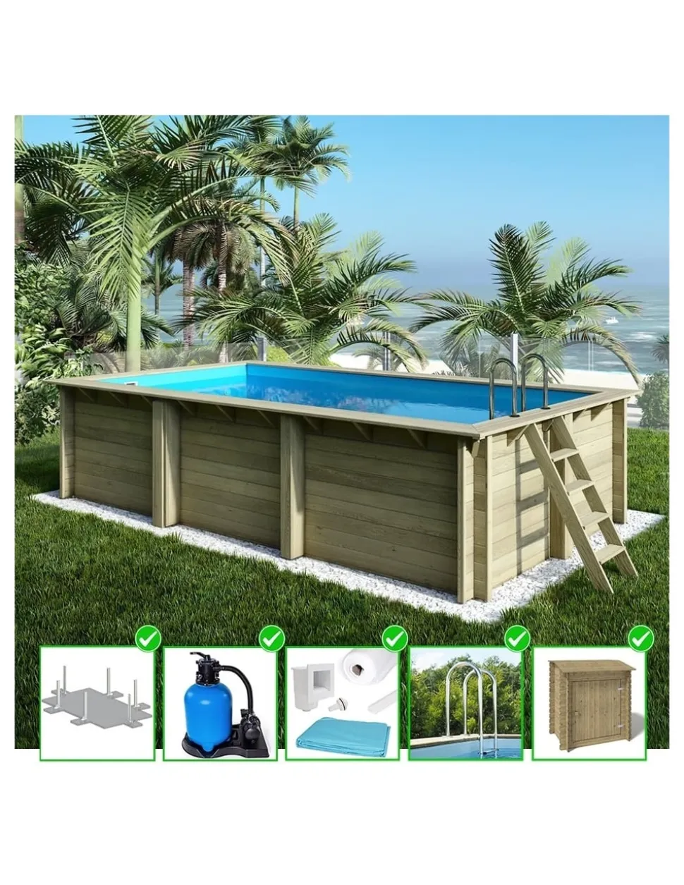 Piscine en bois BAS7307OSPL+SZA de dimensions 6,1 m x 2,85 m et d’une hauteur de 1,31 m, fabriquée en bois de pin, imprégnée dans la couleur vert. L’épaisseur des planches est de 44 mm (+/- 1mm), garantissant une construction très solide pour la piscine. L’épaisseur des planches de terrasse est de 28 mm. Le modèle proposé BAS7307OSPL+SZA est imprégné par la méthode sous pression-vide (l’une des plus durables et efficaces) avec des produits de la marque KORA® .Installation de la piscine avec la notice fournie ne pose pas de difficultés majeures. Temps estimé pour l’installation : 2 jours. Avant l’installation, il est nécessaire de préparer le sol. Il est recommandé d’avoir une chape en béton d’une épaisseur minimale de 30 cm sous les supports et d’au moins 10 cm sur l’intégralité de la surface occupée par la piscine.FICHE TECHNIQUE :Largeur au sol (m): 5,66Profondeur au sol (m): 2,41Largeur intérieure (m): 5,57Profondeur intérieure (m): 2,32Hauteur paroi (m): 1,28Hauteur faîtage (m): 1,31Épaisseur des planches paroi (mm): 44Épaisseur de la margelle (mm): 28Largeur hors tout (m): 6,1Largeur hors tout (cm): 610Longueur / Profondeur hors tout (m): 2,85Surface intérieure (m2): 12,92Niveau d’eau (m): 1,15Forme: rectangulaireDiamètre int. de la piscine (m): 6,15Volume d’eau (m3): 14,83Traité: ouiType de protection: traitement autoclaveCouleur: vertType de construction: emboîtéDim. Palette (largeur x longueur x hauteur cm): 120x392x134Durée de garantie (années): 10Type de bois: pinINCLUS :- supports métalliques à visser- Liner de couleur bleue et d’épaisseur 75/100- revêtement sous le liner – feutre- profilés de fixation pour le liner- système de filtration (débit de la pompe : 6m3/h | filtre à sable)- sable pour le filtre- pompe- skimmer- buse de refoulement- échelle piscine en acier inoxydable- raccords et tuyauterie pour installer la pompe et le filtre- coffre de filtration – couleur vert- échelle exté