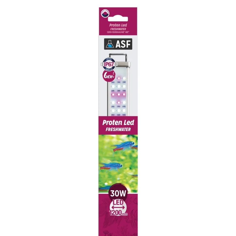 La rampe Leds Proten d’Aquarium Systems, de classe énergétique A+, répond aux normes IP67. Elle est destinée aux aquariums d’eau douce de 120 à 150 cm. Ses dimensions s’adaptent pour des aquariums de 120cm à 150cm . Un double interrupteur permet de contrôler les Led blanches indépendamment des Led roses. Afin de minimiser le bruit, le refroidissement est effectué par un dissipateur thermique et non pas par des ventilateurs. Son épaisseur permet de l’intégrer facilement au dessus de l’aquarium.