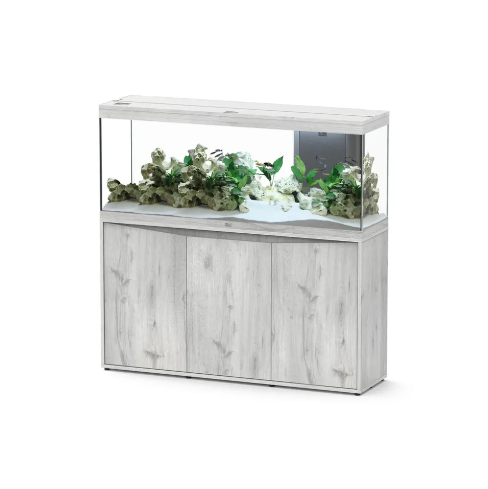 Un bel aquarium, n’est-ce pas l’atout charme d’une déco d’exception qui transporte un petit morceau de nature dans votre intérieur ? Avec ses 366 litres de volume brut, cet aquarium met à votre disposition un peu moins de 300 litres d’eau de volume utile pour exprimer votre créativité. Vous pourrez créer un magnifique paysage aquatique pour que vos poissons évoluent parmi des roches, racines et massifs végétaux luxuriants. Riche en couleurs, votre aquarium animera votre salon tel un véritable tableau vivant ! L’aquarium Splendid Led est équipé d’un filtre intérieur Biobox 3 et d’un chauffage Easyklim 300 avec thermostat ajustable. Vous pourrez ainsi associer entre 30 et 60 poissons en fonction de leur taille adulte pour peupler harmonieusement votre nouveau milieu aquatique. L’éclairage Led de haute qualité à basse consommation d’énergie qui équipe cet aquarium fournit une lumière naturelle en couvrant un spectre très proche de celui du soleil. Les plantes aquatiques bénéficiant ainsi d’excellentes conditions de croissance, vous pourrez en associer différentes variétés de différentes formes et couleurs, y compris parmi les plus exigeantes. Aquarium équipé Splendid Led 2.0 Chêne Blanc L.150xP.40xH.61cm et L.150xP.40xH.83 cm pour son meuble.