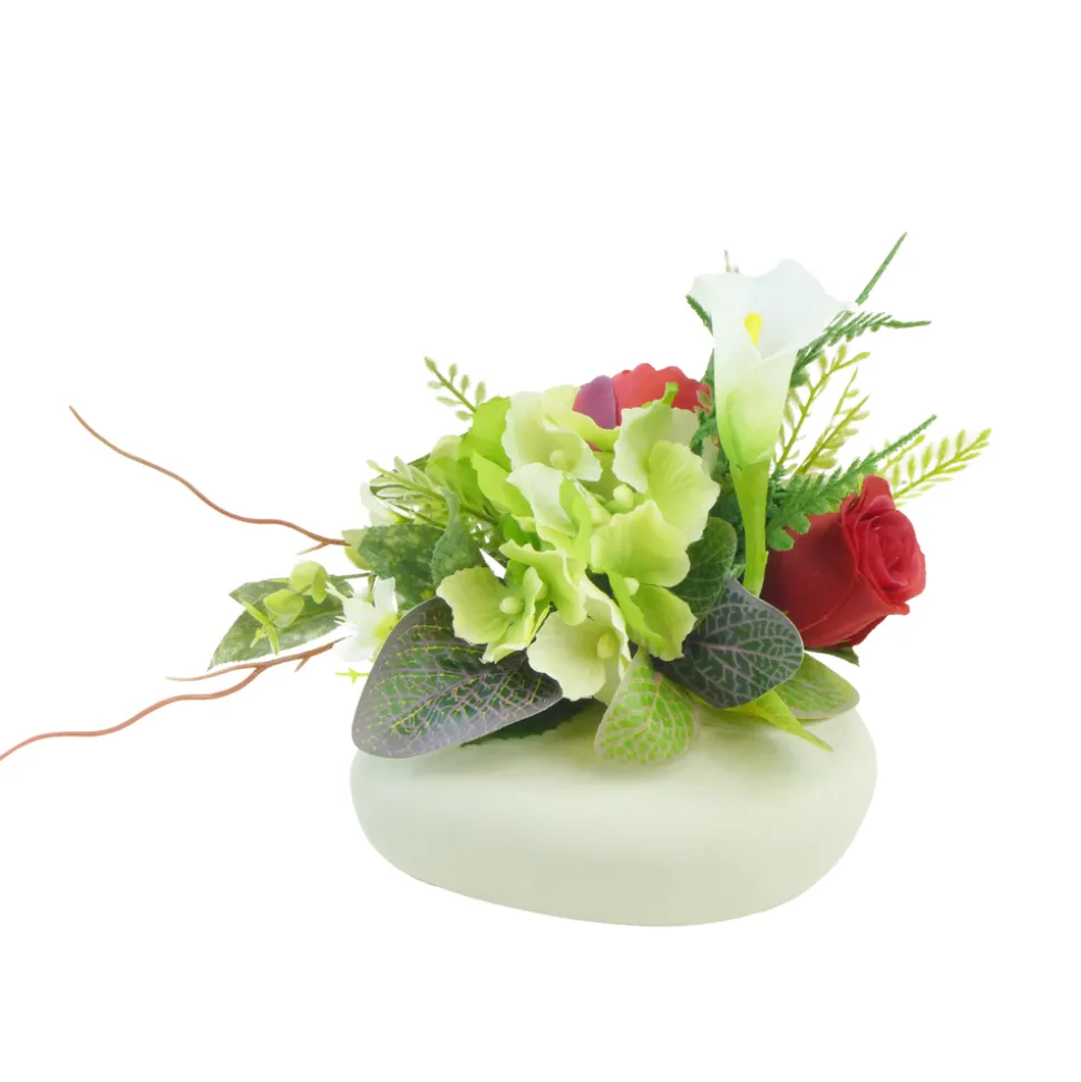 Très en vogue, les fleurs artificielles sont de plus en plus belles et d’un réalisme à s’y méprendre. Composer votre propre bouquet devient ainsi plus facile avec des plantes élégantes et durables. Autrefois, toutes en plastique ; elles sont davantage en textile aujourd’hui (principalement tergal et polyester) : ce qui leur confère une finition irréprochable et un toucher plus agréable, plus doux et moins froid. Quel plaisir de posséder chez soi et tout au long de l’année des plantes exotiques, des fleurs hors saison ou des bouquets plus vrais que nature et ce, quels que soient le climat, la luminosité ou l’absence d’entretien. Et oui, les plantes artificielles sont impérissables ! Ces fleurs artificielles sont disposées dans leur propre pot adapté, ce qui vous permet de les placer à l’endroit de votre choix dans votre intérieur. Composition florale artificielle cœur ciment D.20 H.20cm.