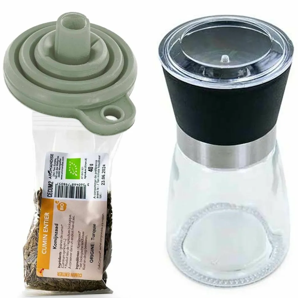 Moulin à épices, entonnoir et cumin entier bio. Cet élégant moulin à épices est maniable et facile à nettoyer à la main. Il est conçu en verre avec un mécanisme en céramique réglable en fonction du broyage souhaité. Hauteur 13 cm. Diamètre : 6 cm. Contenance 140 ml. L’entonnoir en silicone, facile à laver, permet de remplir votre flacon. Sa forme évasée permet de verser les épices et facilite leur descente dans le récipient. L’entonnoir est pliable et prend donc très peu de place dans les placards, vous pouvez aussi le transporter. Emballé dans une boîte en carton recyclé. Hauteur 7 cm. Diamètre : 7,5 cm. Le sachet de cumin entier bio est conditionné en sachet dégradable 40 g. Cette protection transparente biosourcée à partir de cellules végétales permet de préserver au mieux l’arôme du cumin, puis d’être compostée, pour une biodégradation en 90 jours seulement. Le sachet comprend une étiquette en papier repositionnable à coller sur le flacon : une fois chez vous, transvasez les épices dans un récipient adapté, puis collez l’étiquette dessus.
