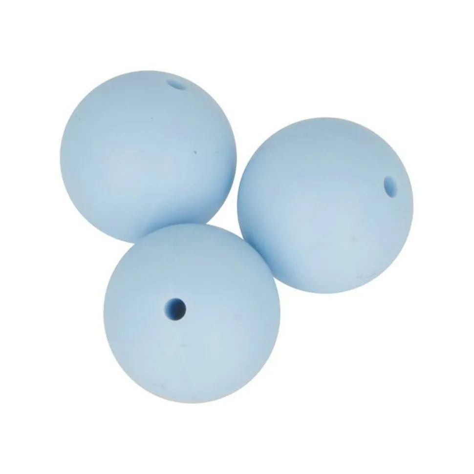 Sachet de 3 perles rondes en silicone bleu pastel – 15 mm. Avec ces perles de silicone, vous pouvez fabriquer des accessoires (pendentifs, colliers) à mâcher pour votre bébé. Les perles de silicone aident au développement des dents.