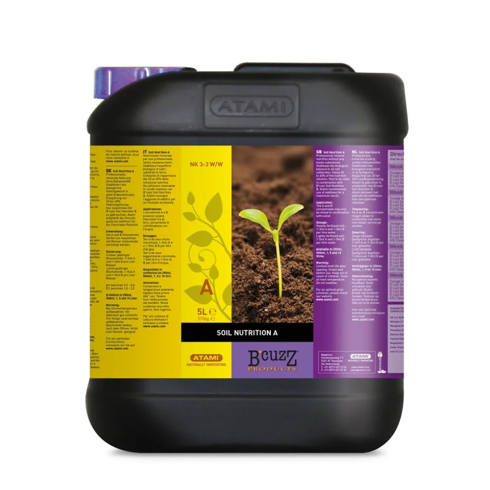 Soil Nutrition A est un engrais minéral qui s’utilisera en croissance et en floraison pour tous les végétaux cultivés en substrat terre ou terreau. Il devra être utilisé en combinaison avec Soil Nutrition B.