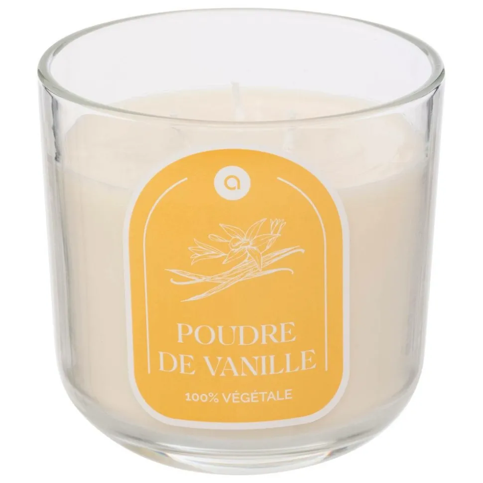 Laissez-vous séduire par la bougie parfumée* » Floa » Atmosphera et profitez d’un parfum de vanille dans votre intérieur ! Placés dans un photophore cylindrique en verre, ses 610 g de paraffine vous offriront jusqu’à 50 heures d’ambiance olfactive grâce à trois mèches en coton. Vous pourrez recycler le contenant une fois la bougie consumée en y plaçant une bougie chauffe-plat.