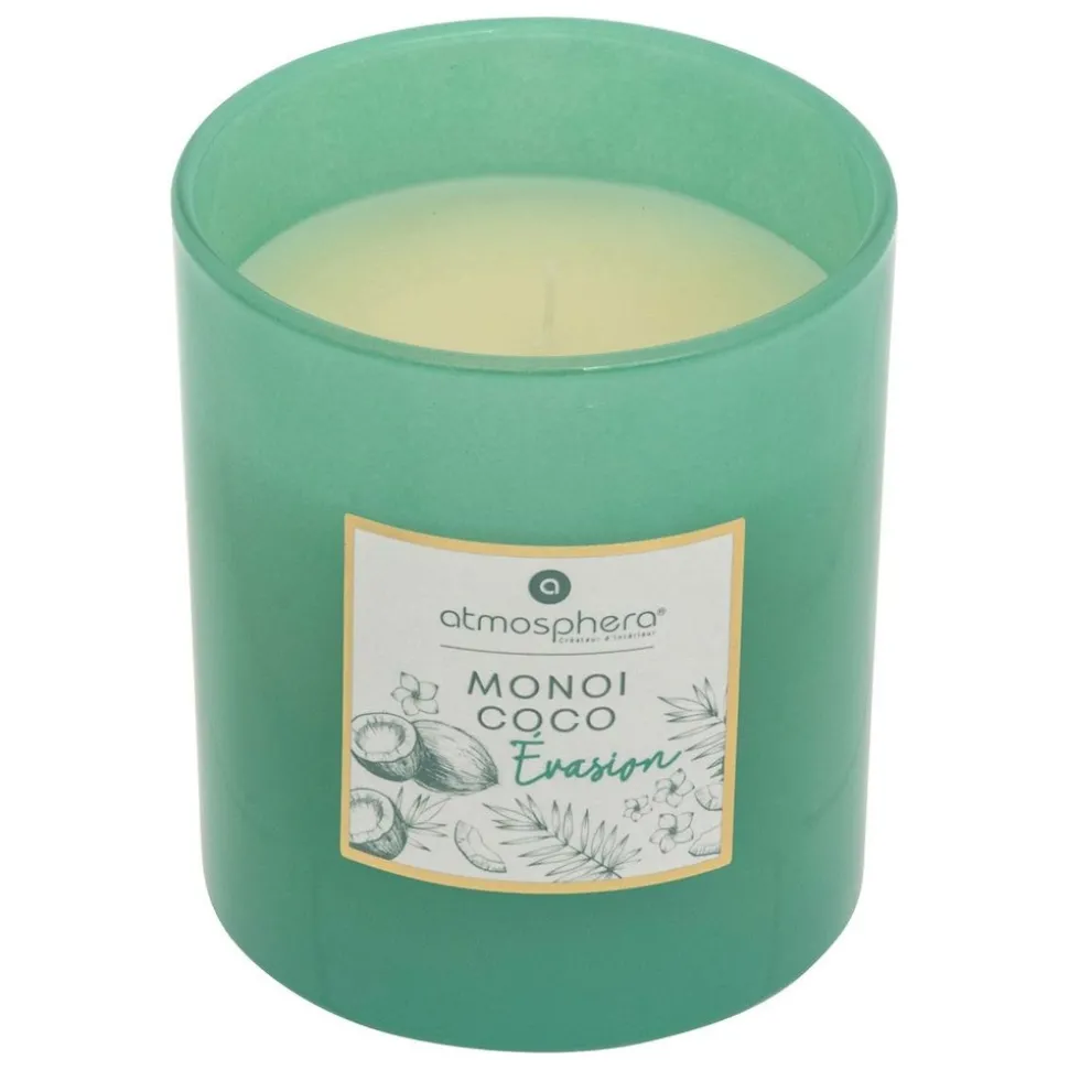 Profitez d’une ambiance exotique avec la bougie parfumée* « Mael » Atmosphera ! Placée dans un flacon cylindrique en verre coloré, elle vous procurera jusqu’à 40 heures de senteur savoureuse et propice à l’évasion. Après la combustion de ses 190 g de paraffine parfumée au monoï et au coco, vous pourrez transformer le contenant en photophore.