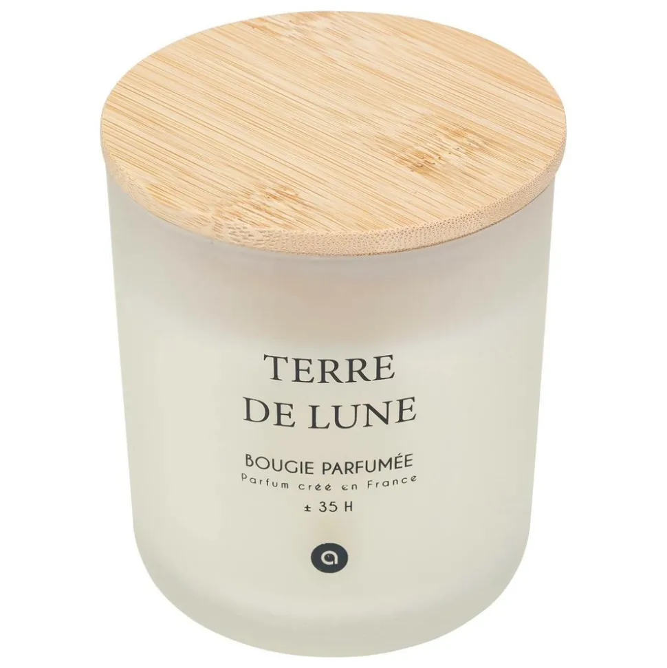 La bougie parfumée* « Terre de Lune » Atmosphera séduira les amateurs de senteurs musquées. Ses 255?g de paraffine aux pétales de musc vous offriront environ 35 heures d’ambiance olfactive, la combustion s’effectuant grâce à une mèche en bois. Dotée d’un couvercle en bambou, elle est très facile à éteindre.