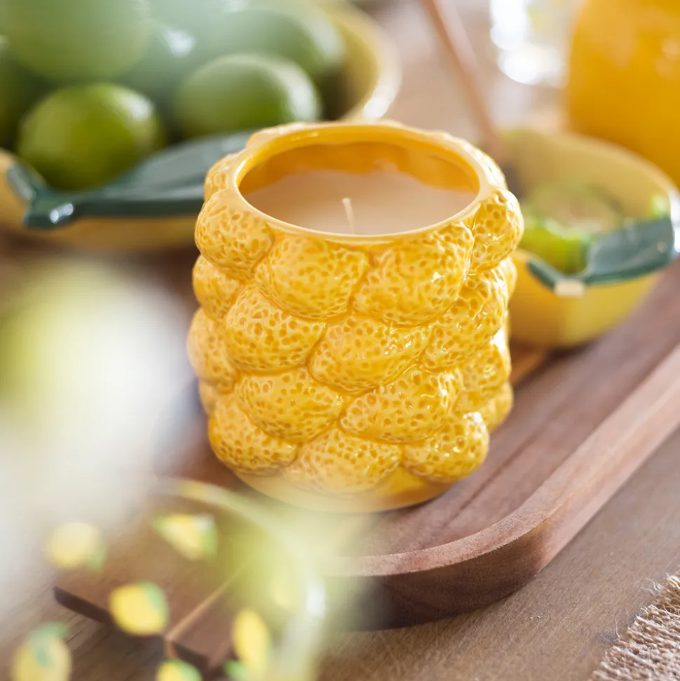 Faites souffler un parfum d’agrumes dans votre intérieur avec la bougie parfumée* « Yucatan » Atmosphera ! Ses 400 g de paraffine sont teintés dans la masse et placés dans un contenant en céramique dont les citrons en relief déposeront une note colorée sur un meuble. Grâce à ses quatre mèches en coton, elle vous offrira jusqu’à 45 heures de senteur fruitée. Recyclez ce contenant en photophore une fois la bougie consumée et placez-y une grande bougie chauffe-plat.