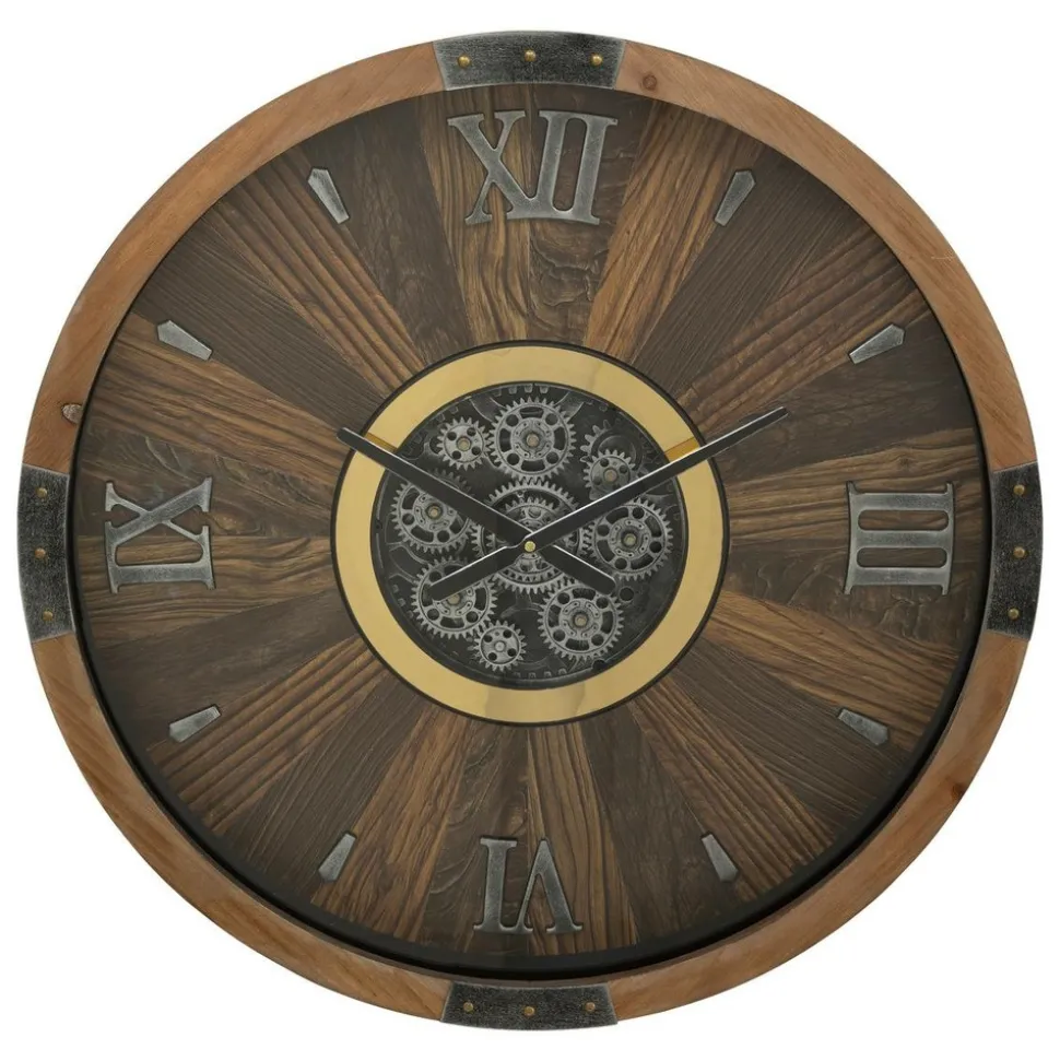 Dans un esprit néo industriel, l’horloge « Keane » Atmosphera joue sur un mix de matières en associant du bois et du laiton. Son diamètre conviendra aux petits espaces et vous pourrez l’associer à du mobilier en bois, en métal, ainsi qu’à des éléments de déco en cuir. Vitrée, elle est dotée de 9 mécanismes à engrenages apparents et mobiles et le fond du cadre présente différentes teintes de bois, pour un rendu très authentique. Silencieuse grâce à un système ABS, elle sera parfaite au-dessus d’un bureau comme dans une cuisine ou une entrée.