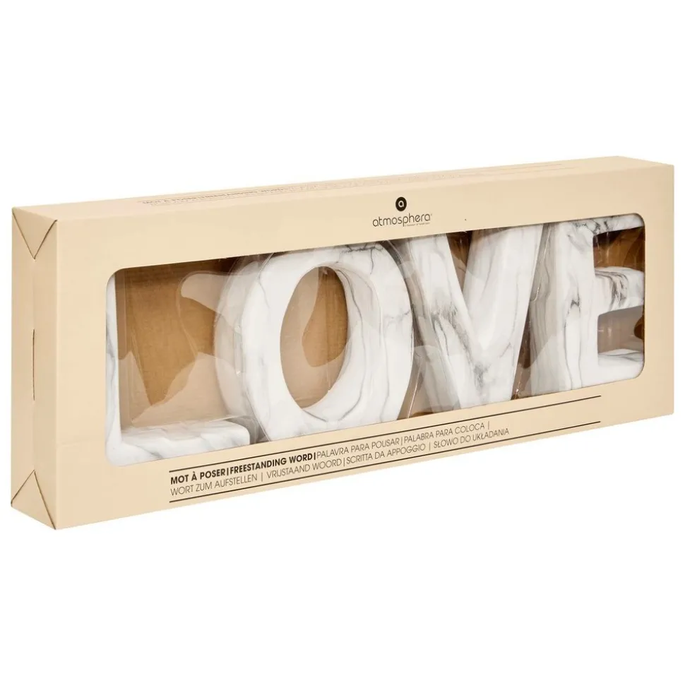 Le mot à poser « Olen » Atmosphera vous permettra d’accessoiriser votre univers avec une note à la fois chaleureuse et sophistiquée. Réalisé en céramique grise au fini marbré, ce mot à poser reprend le mot LOVE en majuscules et sera du meilleur effet sur une étagère ou un meuble en bois foncé. Son grand format ne passera pas inaperçu dans votre déco ! Vous pourrez le coordonner à des objets déco de cette même ligne Atmosphera.