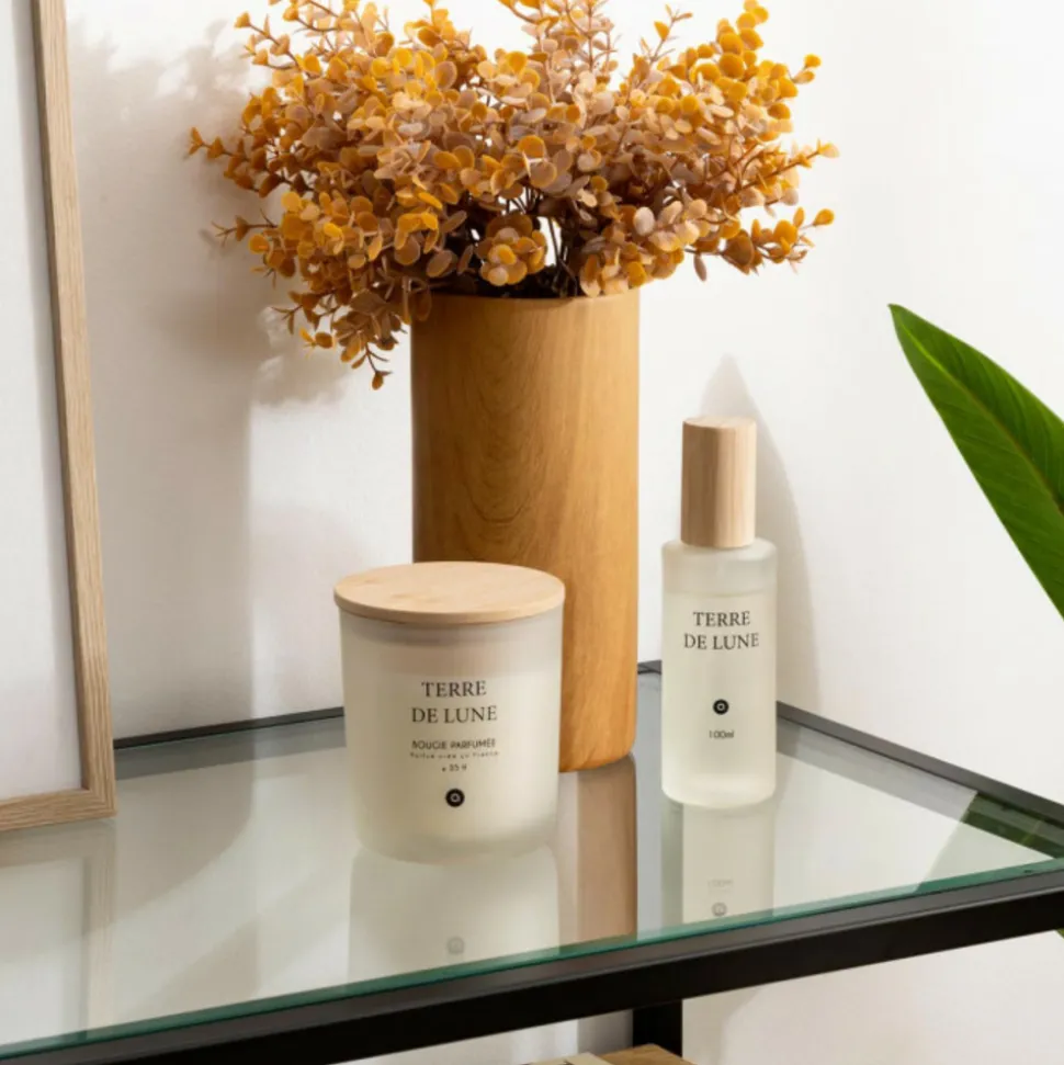 Le spray d’ambiance « Terre de Lune » Atmosphera vous offrira jusqu’à 6 semaines d’un parfum agréable. Son flacon en verre coloré est fermé par un bouchon en bambou et vous pourrez l’associer à un diffuseur de parfum de la même ligne pour créer une ambiance olfactive dans plusieurs pièces.