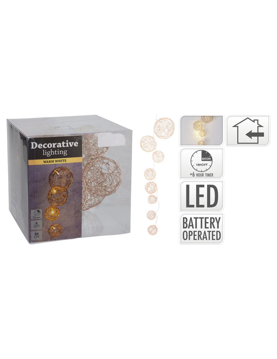 Guirlande avec 8 boules de jute de divers diamètres avec led, blanc chaud, 8 led, alimenté par batterie, minuterie 6h, 90cm. basics