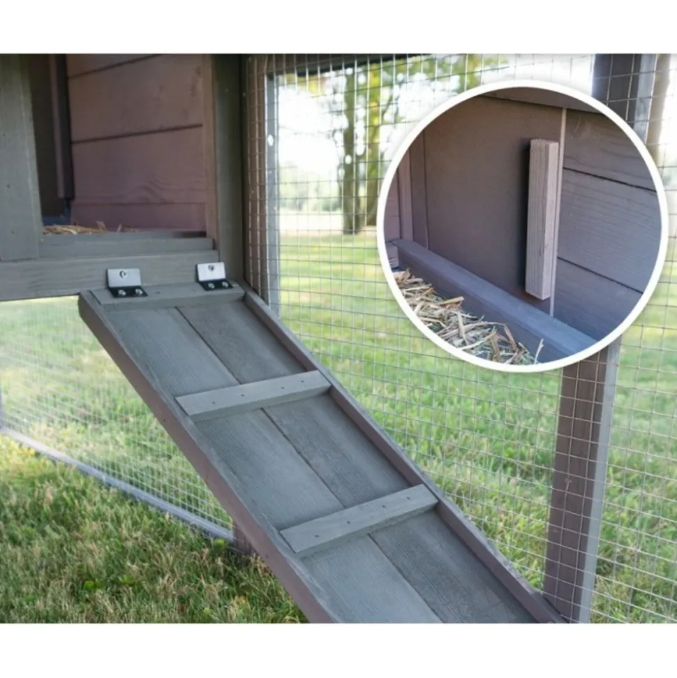 l’écurie pour petits animaux avec le grand enclos extérieur garantit suffisamment d’exercice. Deux portes dans l’enceinte d’exercice vous permettent d’accéder à tous les coins. Une large rampe en bois mène à l’écurie. L’escalier peut être fermé par une porte coulissante si les animaux doivent rester dans la grange fermée ou si vous souhaitez nettoyer la grange.br>