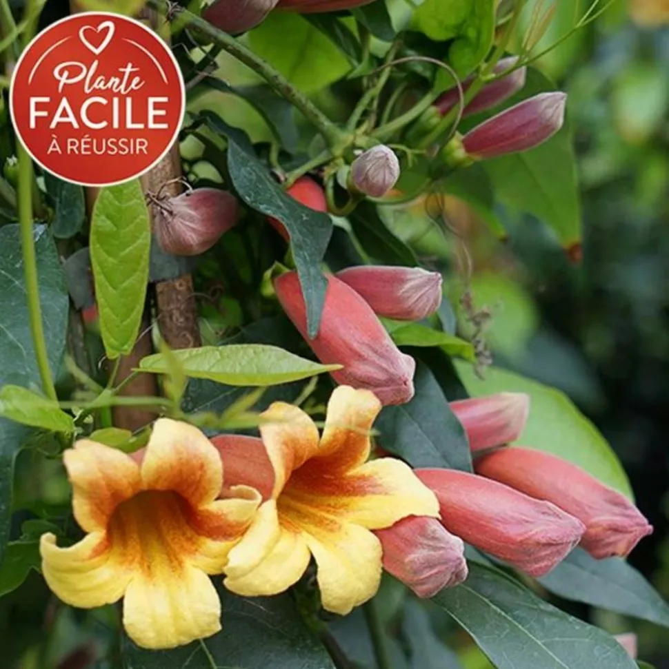 Cette bignone capreolata à vrilles peut s’accrocher jusqu’à 6 m sur son support. Facile à vivre, elle s’adapte à tous les types sols (avec une préférence pour les sols drainés) et à toutes les expositions. Sa floraison printanière parfumée a lieu en mai, mais peut débuter dès avril selon les régions. C’est une variété rustique jusqu’à -15 C. Cette bignone orangée sera un véritable atout décoratif pour votre extérieur.
