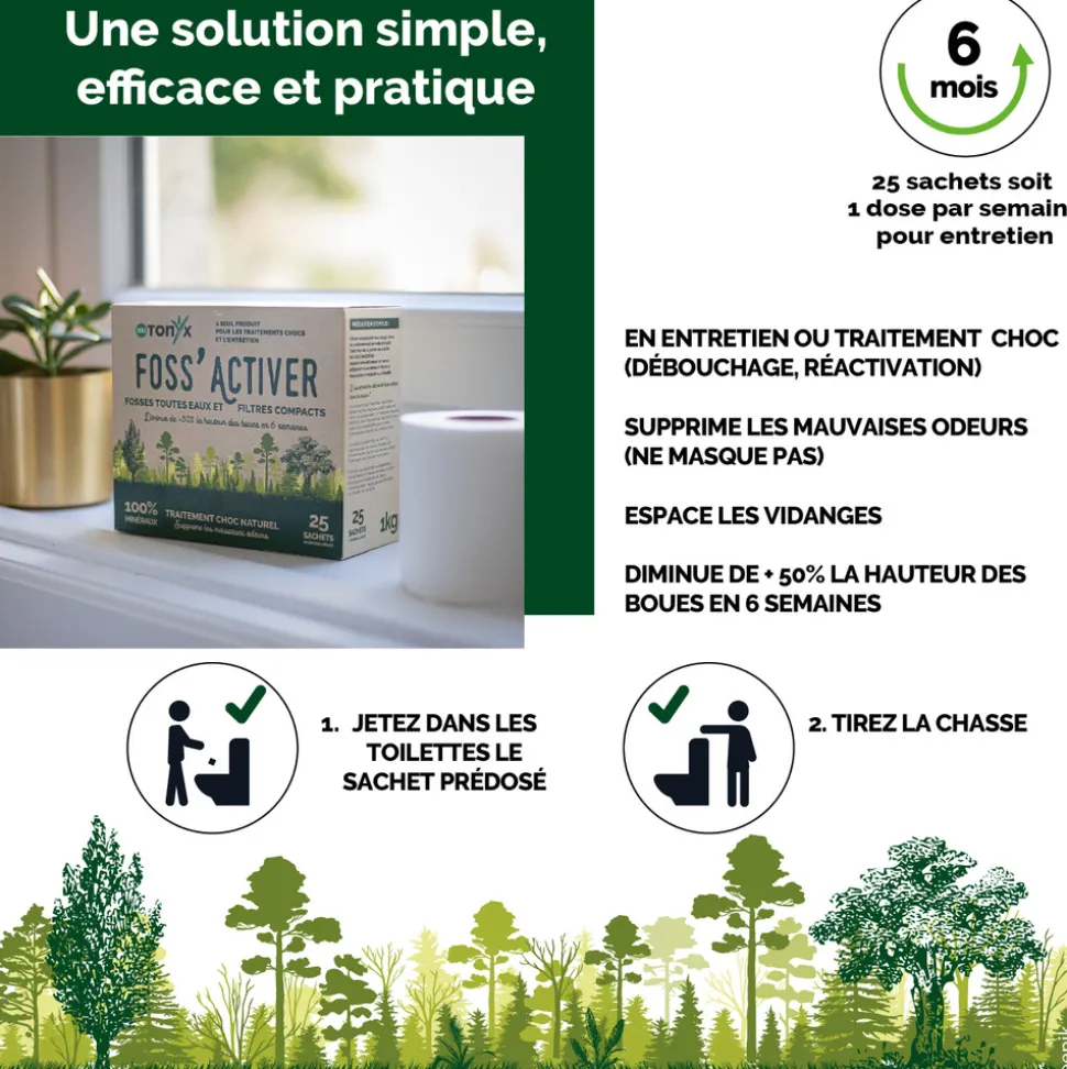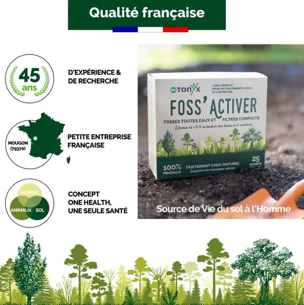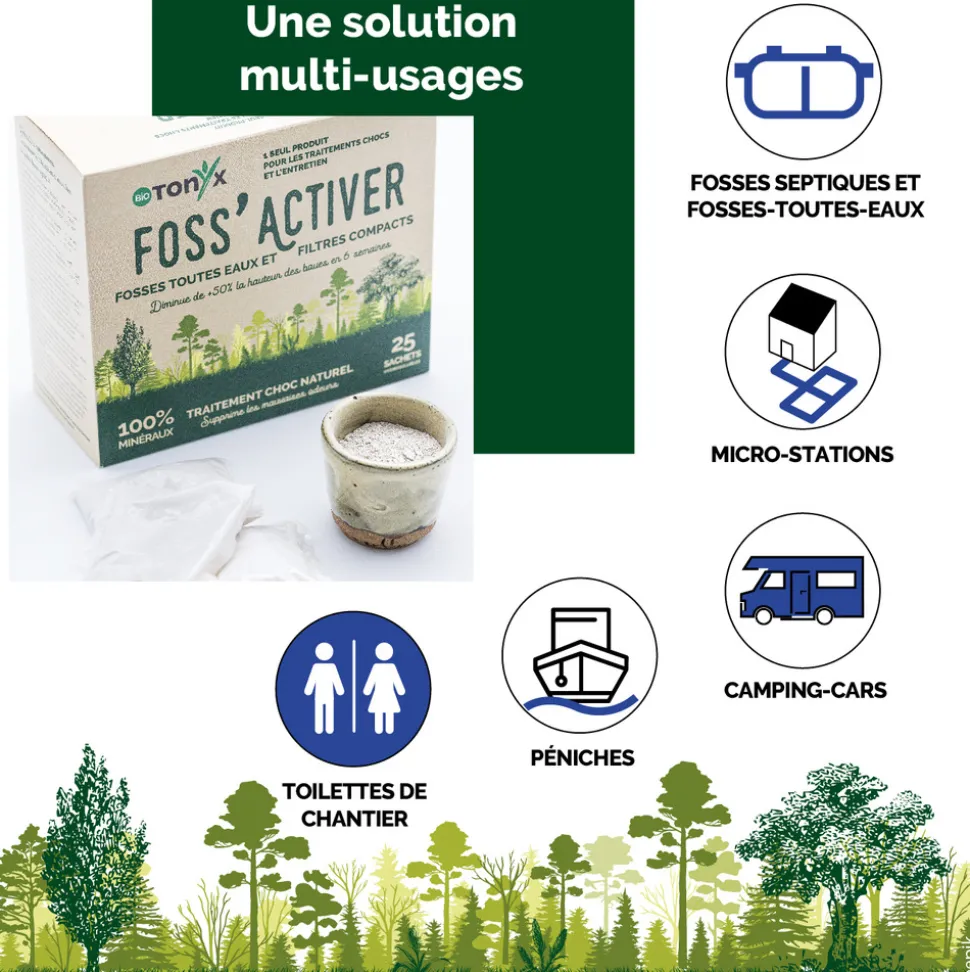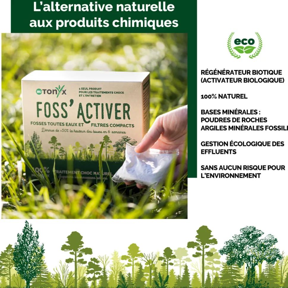 FOSS’ACTIVER est un équilibre naturel de poudres de roches et d’argiles fossiles qui favorise un environnement microbien sain. Ce régénérateur biotique stimule les bactéries naturellement présentes pour un contrôle efficace. Écologique et sans risque pour l’environnement, il optimise la gestion des effluents en réduisant les boues et en supprimant les mauvaises odeurs grâce à la restauration de l’équilibre biologique et à l’action sur le pH, l’ammonium et les nitrates.