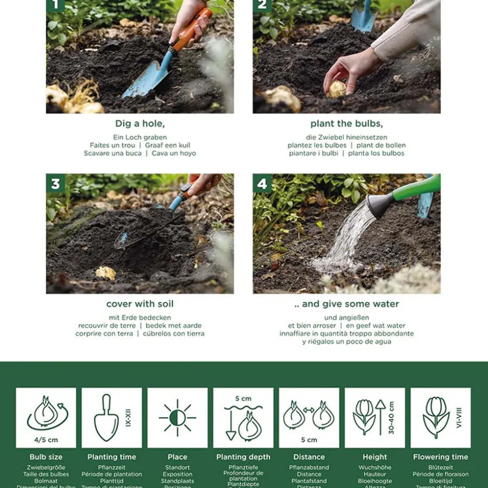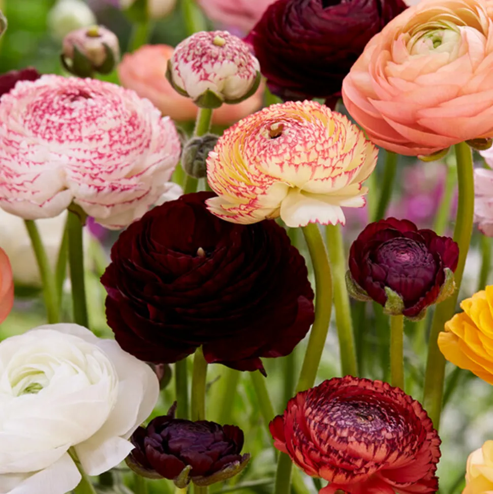 La renoncule est une belle fleur aux pétales superposés qui rappellent les pivoines, mais ils sont un peu plus petits. Ils viennent dans une large gamme de couleurs, où vous trouverez des nuances de rouge, orange, jaune, rose et blanc dans ce mouvement. Les fleurs poussent sur des tiges minces et possèdent des feuilles pennées. Ils atteignent une hauteur d’environ 30 centimètres, à condition que les bulbes à fleurs poussent dans des conditions optimales. Les renoncules fleurissent entre mars et mai, ce qui en fait de véritables fleurs printanières. De plus, les renoncules sont d’excellentes fleurs coupées, vous pouvez donc également profiter de leur belle apparence à l’intérieur. Êtes-vous prêt à enrichir votre jardin avec ces belles fleurs ?Caractéristiques- Livré par 50 pièces- Facile à maintenirSe soucier – Eau : Moyenne. Une fois plantés, les bulbes à fleurs ontbesoin d’eau très régulière. Une fois qu’ils ont poussé, vous devez ré-arroser les renoncules tous les quelques jours. En cas de chaleur extrême, ils ont besoin d’eau tous les jours.- Position : Ensoleillé à mi-ombragé. La renoncule préfère les endroits très ensoleillés, la fleur peut également prospérer à l’ombre partielle. – Entretien : Peu. Les fleurs fanées peuvent être enlevées ou, avant qu’elles n’aient fini de fleurir, elles sont coupées comme fleurs coupées. Vous pouvez déterrer les bulbes après la floraison pour les replanter l’année suivante.