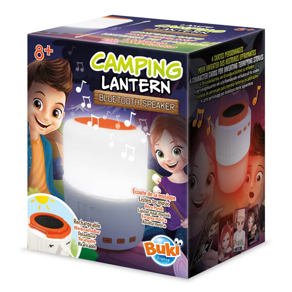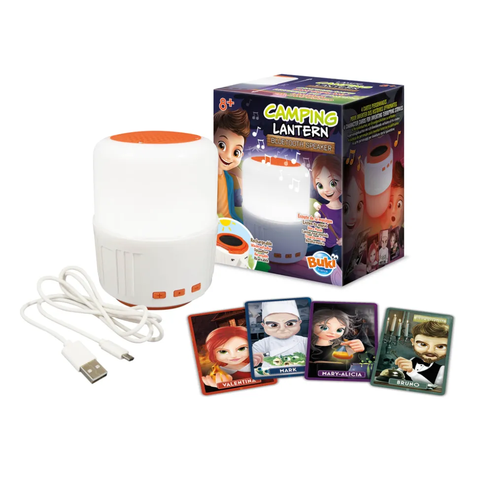 Une lampe de camping rechargeable avec une fonction enceinte Bluetooth. Elle se recharge grâce à son panneau solaire ou avec un câble USB. 3 modes d鈥également une batterie externe et peut recharger d鈥檃utres appareils électriques. Connecte un téléphone ou une tablette en bluetooth pour diffuser de la musique sur l鈥檈nceinte. Mode lumière rouge pour se raconter des histoires qui font peur. Quatre fiches avec des portraits de personnages effrayants inclus. Fonctionne avec une batterie lithium et un câble USB inclus.Cartes illustrées en couleurs.Dès 8 ans.