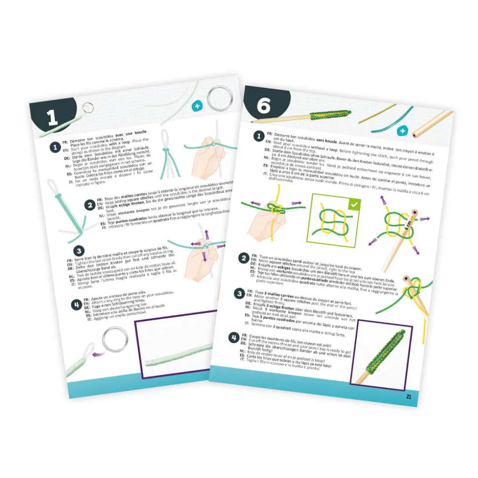 12 modèles de scoubidous à tisser ainsi que des fils supplémentaires pour faire ses propres créations! Des fils colorés, des fils métalliques, des fils transparents et même des fils pailletés sont fournis pour un total de 55 fils. Une fois les 12 projets réalisés, il reste 18 fils pour inventer ses propres modèles !Contient: un assortiment de 55 fils scoubidous, 15 anneaux de porte-clés et 2 crayons de papier. Le niveau de difficulté des modèles proposés est évolutif. Chaque technique est expliquée pas à pas dans la notice avec des schémas pour un apprentissage plus facile. Notice illustrée en couleurs. Dès 6 ans.