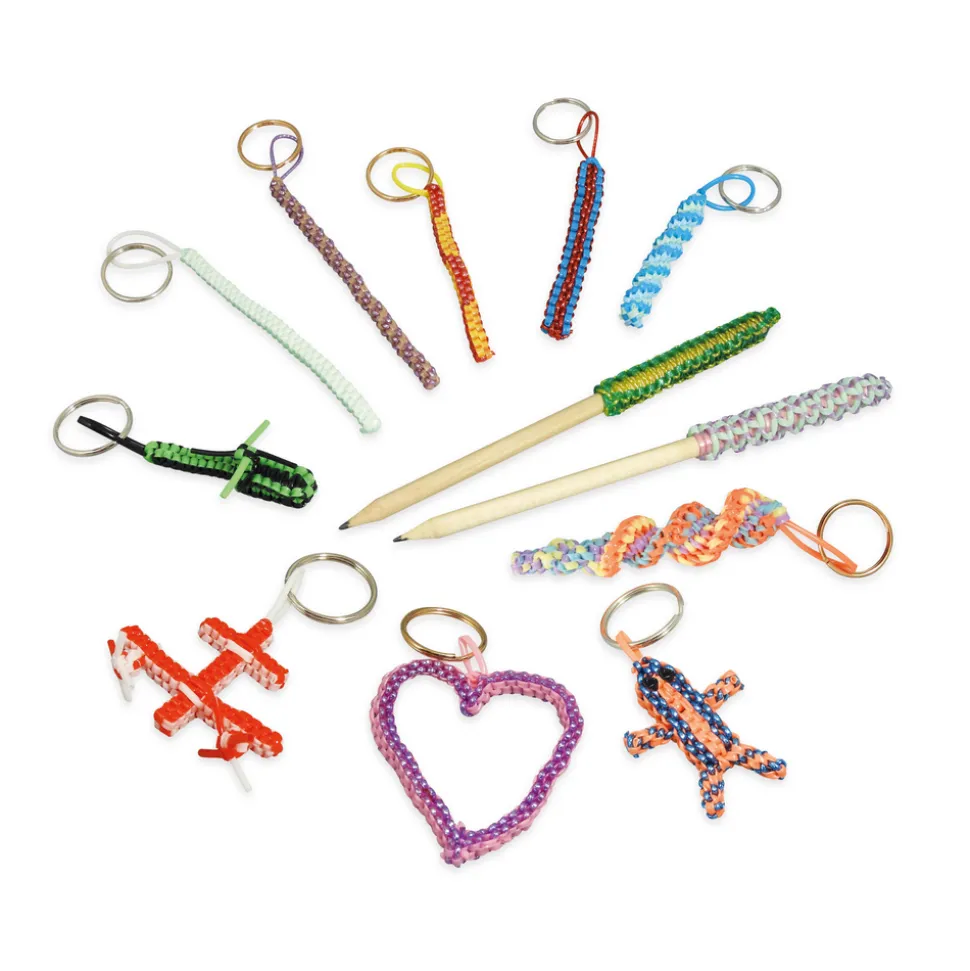 Un set pour apprendre à tisser des scoubidous! Contient 55 fils extra-longs (1,5m) de 4 styles différents : des fils colorés, des fils métalliques, des fils transparents et même des fils pailletés ! 15 anneaux de porte-clés, 2 crayons à papier ainsi que 12 projets inclus dans la notice. Une fois les 12 projets réalisés, il restera encore 18 fils pour inventer ses propres modèles ! Le niveau de difficulté des modèles proposés est évolutif et chaque technique est expliquée pas à pas avec des schémas pour un apprentissage plus facile. Jeux créatifs, dès 6 ans.