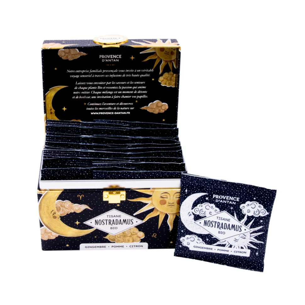Voici une infusion parfumée et pleine de surprises ! La tisane bio Nostradamus marie avec audace les arômes de gingembre, d’hibiscus, de pomme et de myrte citronnée. Présentée dans un coffret en métal finement illustré, elle fera sensation ! Coffret tisane bio : Nostradamus – 20 sachets.