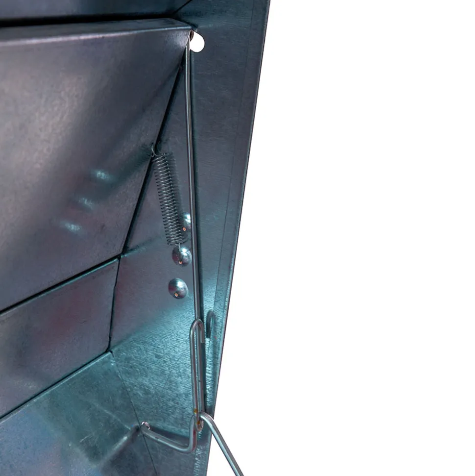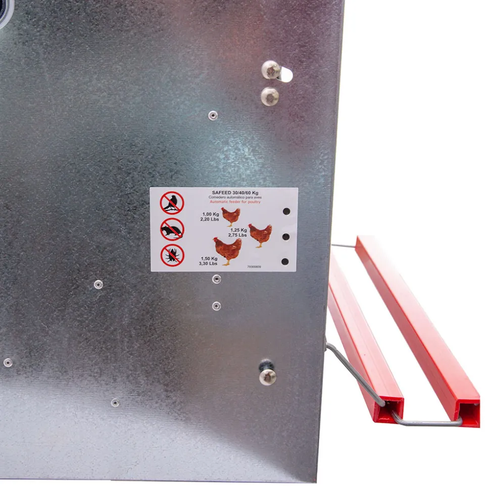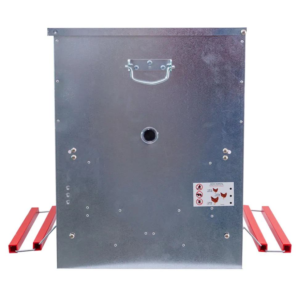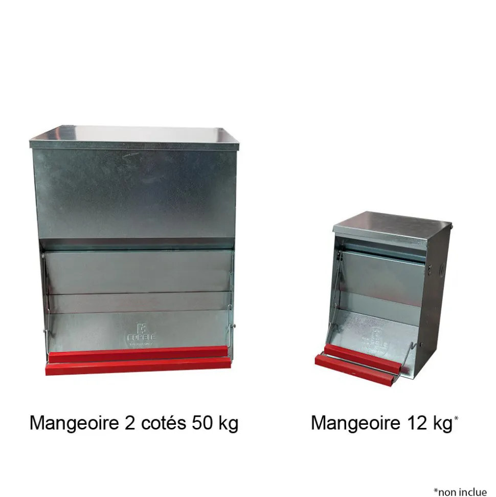 La grande mangeoire 2 côtés peut contenir 50 kg de nourriture, elle permet de nourrir jusqu’à 30 poules. Cette mangeoire anti-nuisible est la seule du marché à être équipée de 2 pédales, les volailles peuvent ainsi accéder à la nourriture des 2 cotés. Les pédales longues de 46 cm et l’accès des 2 cotés permettent à de nombreuses poules de s’alimenter en même temps. La mangeoire est fabriquée en tôle galvanisée offrant ainsi une bonne résistance à la corrosion. La fermeture hermétique conserve les grains propres et secs et empêche les indésirables, tels que les oiseaux ou les rongeurs, d’accéder aux denrées. Pour accéder à la nourriture, les poules doivent monter sur une pédale en PVC (présence de deux pédales sur ce modèle) afin d’ouvrir la trappe grâce au poids exercé sur la pédale. Le ressort en acier inoxydable assure un retour de la pédale en douceur et sans bruit afin de ne pas effrayer les volailles. 3 points de réglage sont possibles en fonction du poids de la volaille alimentée ; ce système permet ainsi d’éviter le gaspillage. Des fenêtres sont présentes de chaque côté de la grande mangeoire 2 côtés. Ces dernières, situées à 1/3 de la hauteur de la mangeoire, permettent de surveiller le niveau de remplissage sans ouvrir le couvercle. Caractéristiques : Dimensions l x p x h : 50.5 x 48 x 60 cm Poids : 9 kg