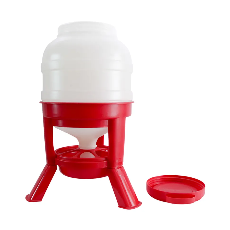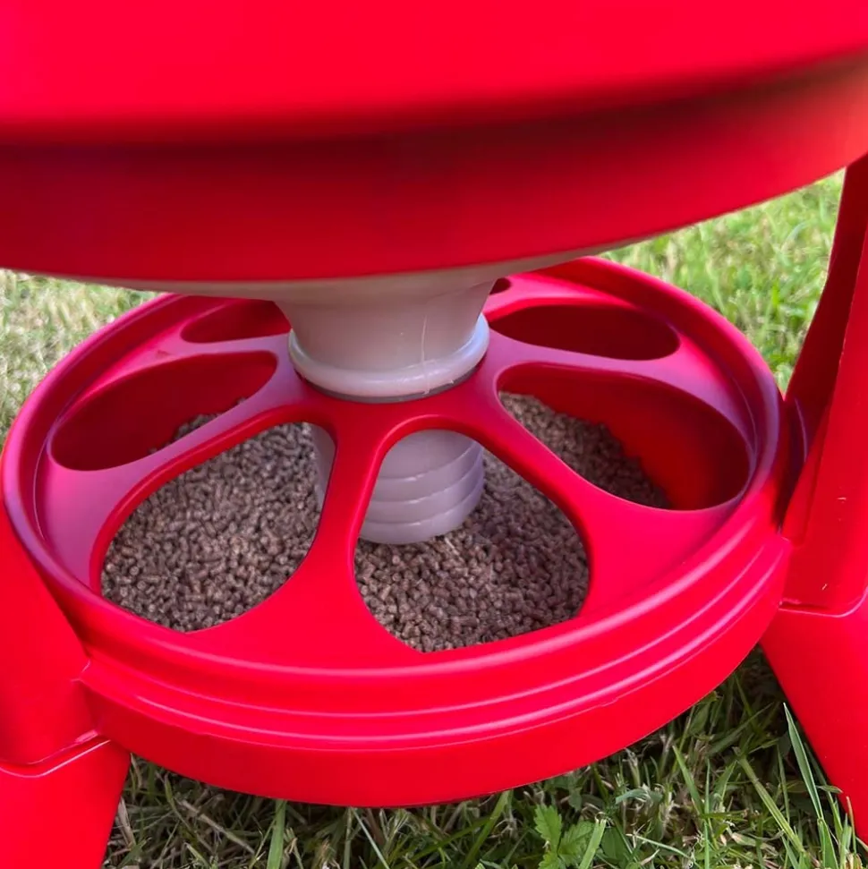 La mangeoire pour volailles 30L est dotée d’un fût de 46cm de diamètre et 67.5cm de haut. Ce dernier peut accueillir jusqu’à environ 23kg de nourriture pour alimenter 18 poules. Fabriquée en plastique résistant aux chocs, cette mangeoire est durable face aux intempéries. Grâce à ses 3 pieds solides de 13.5cm de haut, elle a une stabilité idéale et conserve ainsi la nourriture au propre et au sec. Que ce soient pour les oies, les canards, les dindons, les paons, les faisans ou les poules, cette mangeoire pour volailles est idéale. Se remplissant par le haut avec son ouverture facile, elle approvisionne vos animaux à un niveau constant dans son assiette de 29cm de diamètre. Une grille pivotante permet d’éviter le gaspillage.