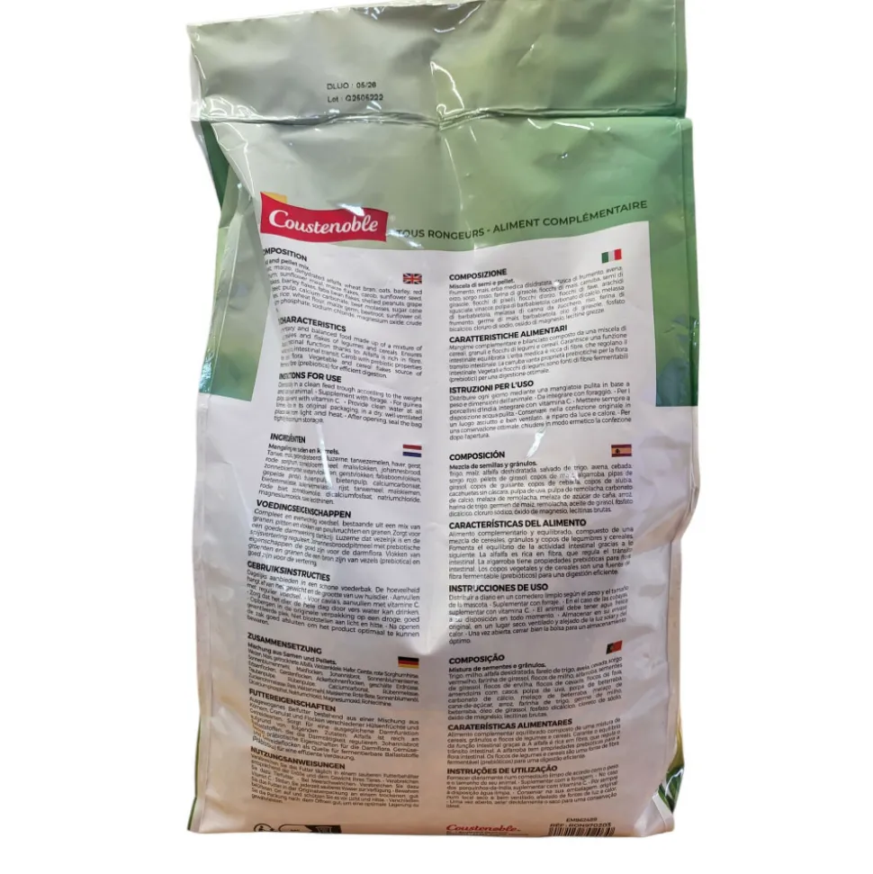 Flocons de légumes et de céréales, avoine, orge, blé, caroubes, maïs, sorgho roux, tournesol, extrudé de maïs, carotte, farine de maïs, huile de tournesol, betterave, extrudé (maïs, blé, luzerne, farine de maïs, betterave, orge, huile de tournesol, son de blé), extrudé (maïs, pois, luzerne, carotte, huile de tournesol), granulé oligo-vitaminique, arachide décortiquée.