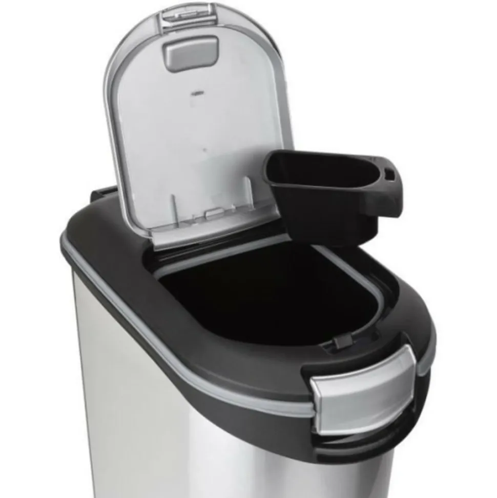Conteneur a croquette 20kg – En polypropylene de haute qualité avec fraicheur préservée grâce a la fermeture hermétique – Grande ouverture prévue pour le rechargement des croquettes et petites ouvertures pour le versement – Aspect métal – Coloris : gris.