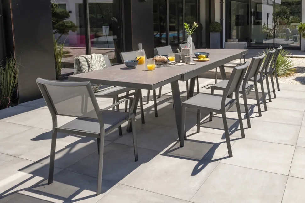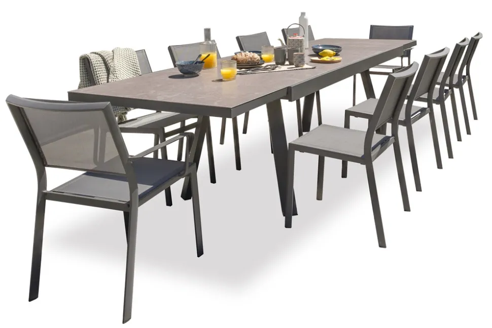 L鈥檃lliance parfaite de l鈥檃luminium gris anthracite de la structure et d鈥檜n plateau non rayable en ce虂ramique sur verre. La rallonge inte虂gre虂e permet de be虂ne虂ficier d鈥檜ne table de jardin de 3 me虁tres pouvant accueillir jusqu鈥檃虁 12 convives.Les chaises de jardin STOCKHOLM en textilène et aluminium gris anthracite sont empilables.Les fauteuils de jardin STOCKHOLM en textilène et aluminium gris anthracite sont empilables.Ensemble composé de : une table STOCKHOLM, 8 chaises STOCKHOLM et 2 fauteuils STOCKHOLM