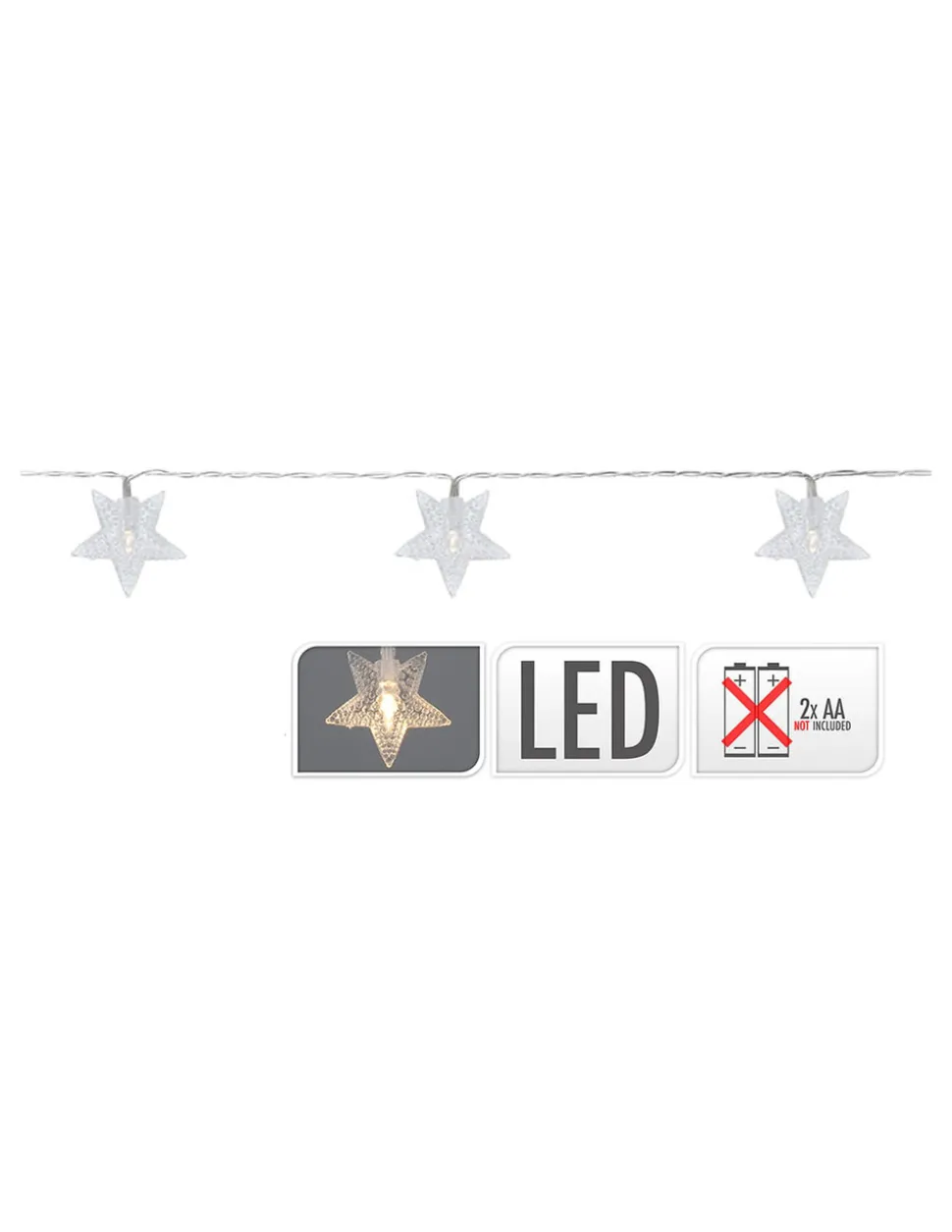 Guirlande 10 leds avec piles 10 étoiles blanc froid 10 leds, cable transparent piles fonctionne avec 2 piles aa non incluses. cable d’alimentation 30cm. distance entre la première ampoule et la dernière 1m. longueur totale: 1,3m