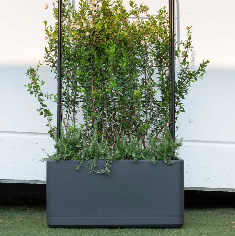 Découvrez la gamme Cosmo : des bacs en forme de cube, alliant élégance et fonctionnalité grâce à leur réserve d’eau intégrée. Fabriqué en France à partir de plastique issu du tri sélectif, ce bac de 74 L est la solution parfaite pour vos plantes d’intérieur et d’extérieur puisqu’il est équipé de roulettes. Grâce à son bouchon amovible et sa jauge de niveau, vous pouvez suivre en un coup d’œil si votre plante a besoin d’un petit arrosage. Son design épuré lui confère un look moderne qui s’intègrera parfaitement dans votre foyer. De plus, sa résistance au gel et aux UV garantit une durabilité remarquable. Grâce à ses roulettes, vous pourrez facilement mettre vos plantes et agrumes à l’abri du gel ! Dimensions : L.78xl.38xH.39cm. Bac muret Cosmo, à réserve d’eau, coloris anthracite – L.78cm.