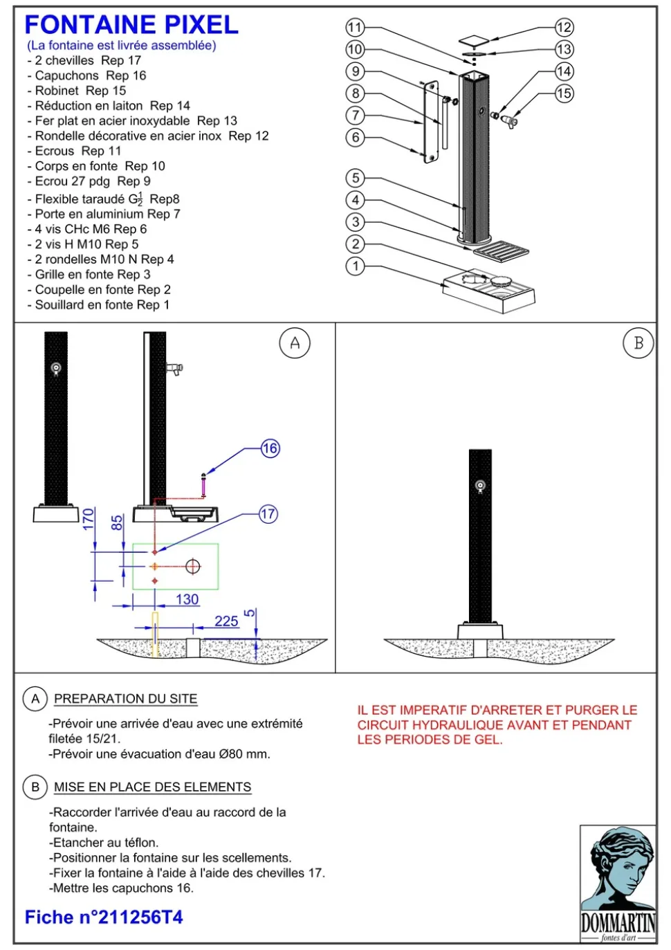 La fontaine pixel avec vasque, est une fontaine centrale contemporaine en fonte, coulée dans nos fonderies de haute-marne, avec le souci du détail et de la qualité. Les composants de cette fontaine en fonte sont d’abord grenaillés puis sablés ; ils sont ensuite métallisés puis peints par thermolaquage assurant un traitement anticorrosion de qualité. Cette fontaine dispose d’une porte d’accès amovible sur fourreau de 15/21. La fontaine est livrée avec un robinet laiton chromé 1/4 de tour, un kit de fixation au sol et une notice d’installation. La hauteur de notre fontaine est de de 103cm, la largeur est de 27 cm et la profondeur de 51 cm. Son poids est de 60 kilogrammes.Fontaine livrée par transporteur privé avec prise de rendez-vous préalable.