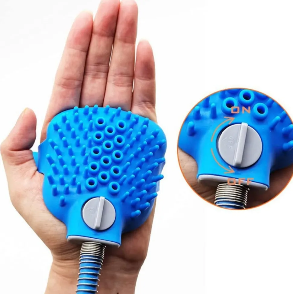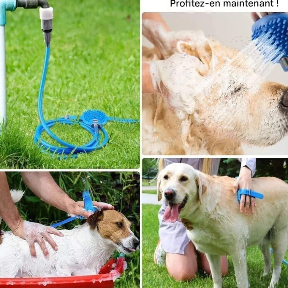 - Douche avec fonction massage : Permet de laver le chien à l’intérieur ou à l’extérieur. La brosse intègre massage tandis que la sangle réglable offre plus de confort.