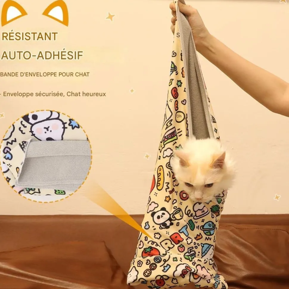 - Design innovant : Enveloppe le chat en toute sécurité, offrant un peu de liberté de mouvement et un toilettage sans stress.