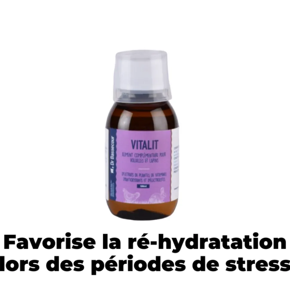 VITALIT est un complément alimentaire pour volailles et lapins qui contribue à renforcer l’immunité et à stimuler la réhydratation pendant les périodes de stress. Il est composé de vitamines C et E, d’extraits de raisin et de pamplemousse, ainsi que de chlorure de magnésium. Ces ingrédients contribuent à protéger les animaux des maladies en périodes de convalescence, de forte chaleur ou pour les jeunes animaux.- Utilisez 5 ml de VITALIT dans 2 litres d’eau pendant 5 jours pour traiter environ 40 animaux de 2 kg. Pour 10 animaux de 2 kg, préparez 2 litres de solution par jour. Limitez l’accès aux points d’eau extérieurs durant le traitement.Ce produit est riche en antioxydants et électrolytes, notamment le sodium, le magnésium et le potassium, qui favorisent la réhydratation. Il est important de ne pas l’associer avec d’autres acides, tels que le vinaigre.