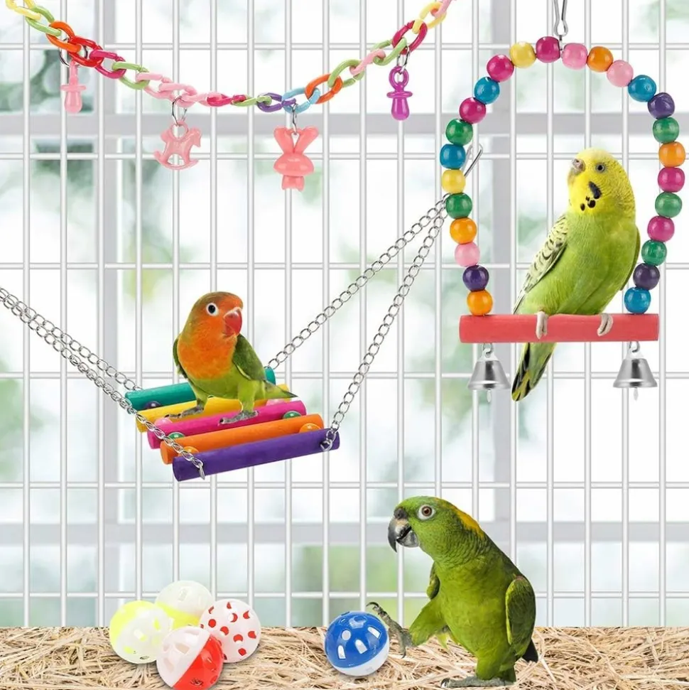 ???? ENSEMBLE DE 11 JOUETS POUR OISEAUX ????Ce lot de jouets pour oiseaux contient 11 pièces de jouets pour perroquets, conçus pour répondre à la plupart des besoins des oiseaux. Les sons clairs des cloches et les jouets en bois colorés attireront l’attention de vos oiseaux. Ils passeront beaucoup de temps à jouer avec ces nouveaux jouets amusants. Ils sont idéaux pour les sports d’oiseaux, la posture, la grimpe, le jeu, la mastication et le repos. C’est le cadeau parfait pour vos amis oiseaux. ????⚡️ CONVENABLE POUR DIVERSES ESPÈCES D’OISEAUX ⚡️Ces jouets pour oiseaux fournissent un endroit élevé pour répondre aux besoins naturels de vos oiseaux. Ils permettent à la plupart des oiseaux de faire de l’exercice et de renforcer leurs muscles. Ils conviennent parfaitement aux petites perruches, cockatiels, conures, araignées, perroquets, perruches, mynas, pinsons, etc. ???????? SUR ET SAIN POUR LES OISEAUX ????Ces petits jouets intéressants pour oiseaux sont fabriqués en bois naturel coloré avec des couleurs comestibles, garantissant la santé et la sécurité de vos oiseaux de compagnie. Ils sont entièrement faits à la main, très durables et résistants aux morsures. Ils attireront rapidement l’attention de vos perroquets de compagnie, les incitant à grimper et à explorer. ???????? FACILE À INSTALLER ????Tous les jouets pour cage d’oiseaux sont équipés d’un crochet qui peut être facilement attaché au sommet de la cage d’oiseaux. Avec ces jouets intéressants attachés dans la cage, en plus d’économiser de l’espace et de décorer la cage, vos oiseaux auront du plaisir tous les jours. ????