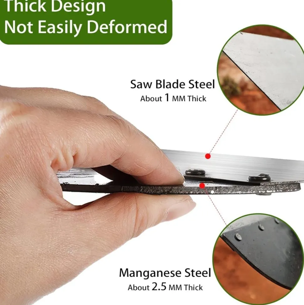 - Acier Au Carbone Hautement Résistant à L’usure: La lame est fabriquée en acier au manganèse épaissi résistant à l’usure et en acier pour lame de scie, durcie par un procédé spécial, solide et durable, difficile à rayer, légère et efficace.