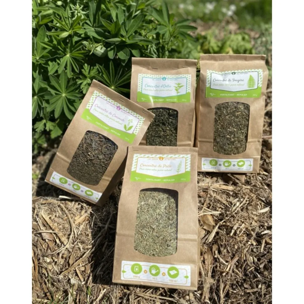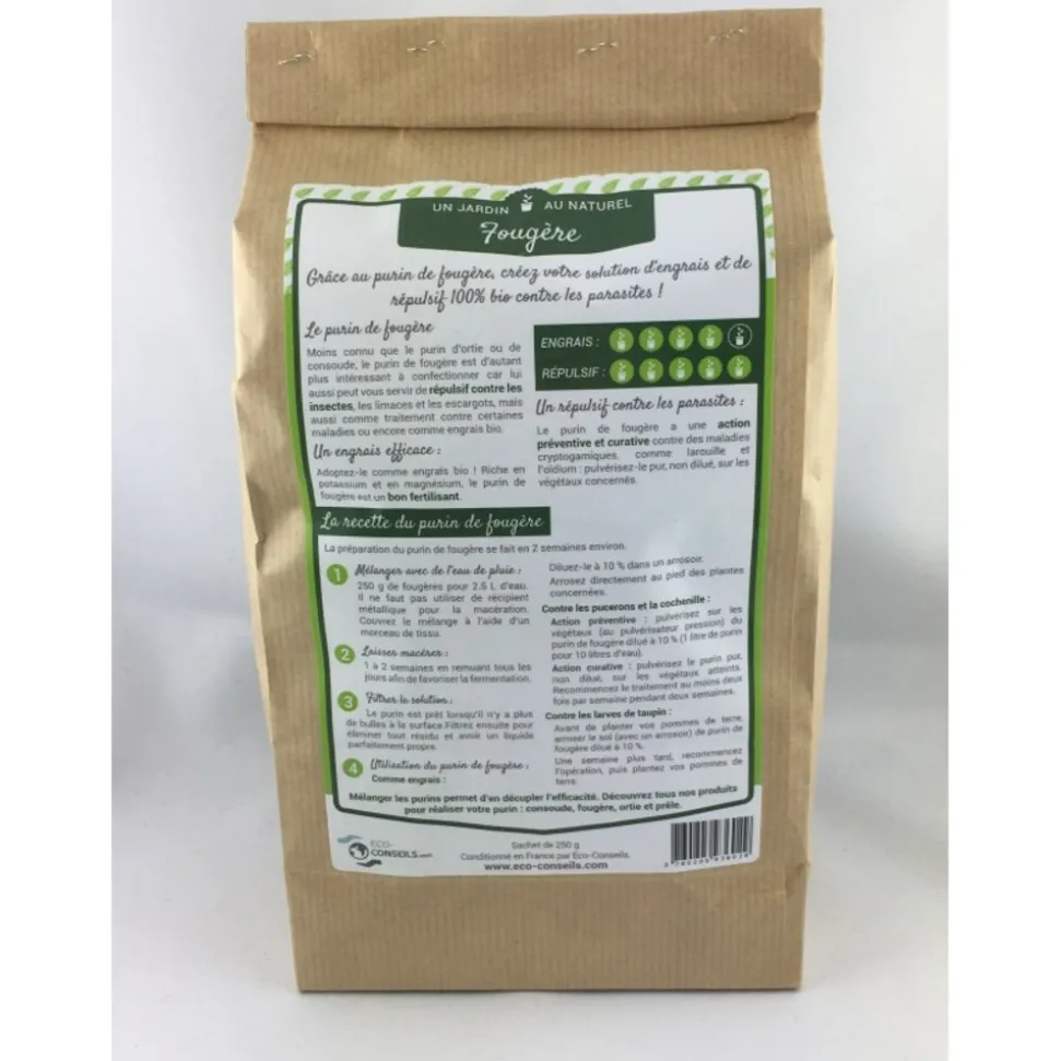 Le purin de fougère peut vous servir de répulsif contre les insectes, les limaces et les escargots, mais aussi comme traitement contre certaines maladies ou encore comme engrais bio.Le purin de fougère a une action préventive et curative contre des maladies cryptogamiques comme la rouille et l’oïdium. Utilisable lors du repiquage pour ses bienfaits sur le développement racinaire. Le purin de fougère s’utilise : en préventif contre les parasites : il crée un terrain défavorable à l’installation de quelques parasites des végétaux, mais aussi dans un but de prévention du fait de sa richesse en minéraux et en oligo-éléments. Anti-fongique : utilisé pur s’emploie contre les maladies cryptogamiques, aussi bien en prévention qu’en curation. Fertilisant : améliore le sol, du fait de sa grande concentration en chaux qui va neutraliser un trop important taux d’acidité. Très riche en azote, en phosphore et en potasse. Le purin peut être utilisé pour fertiliser le pied des plantes en période de croissance. Mélanger les purins permet d’en décupler l’efficacité. Découvrez tous nos produits pour réaliser votre purin de : ortie, consoude et prêle.