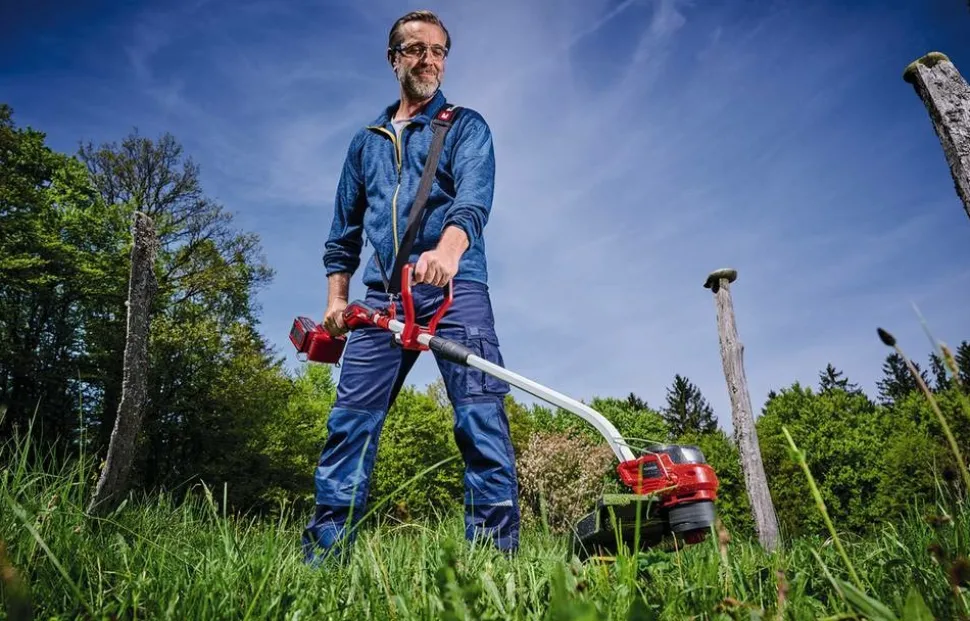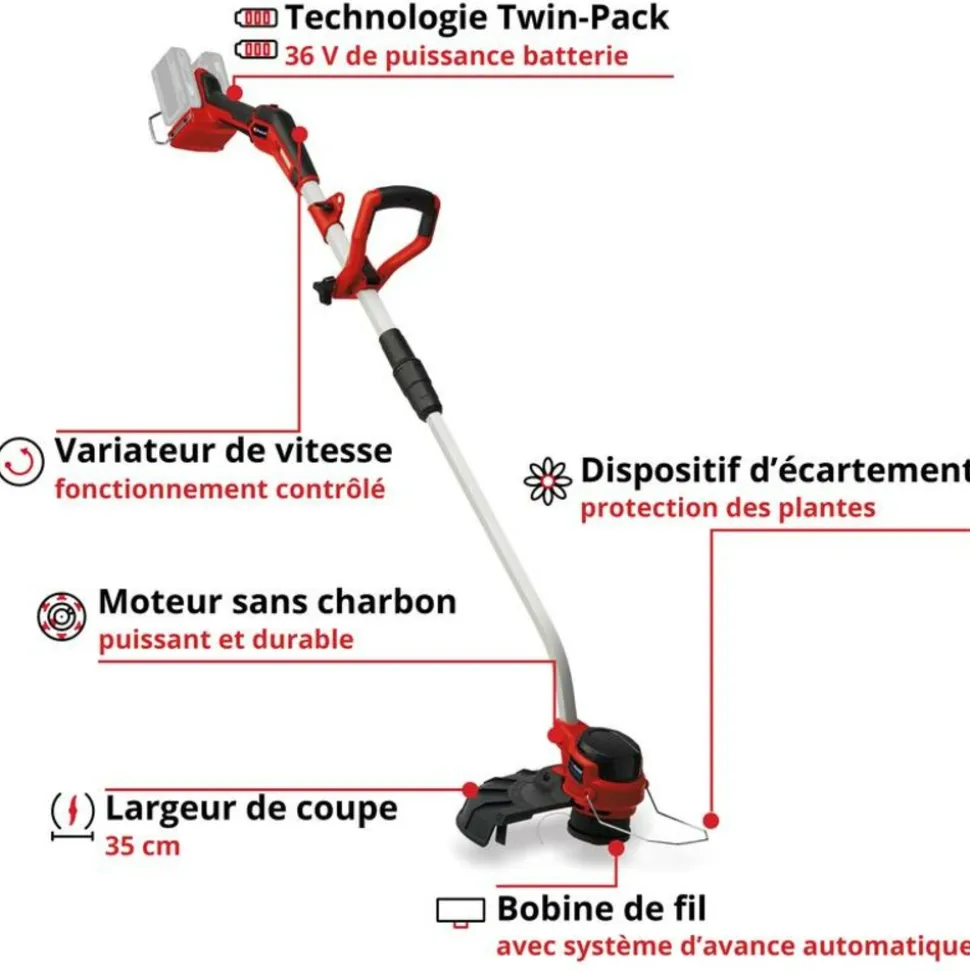 Avec le coupe-bordures sans fil GP-CT 36/35 Li BL-Solo Professional Einhell, les jardiniers disposent, dans leur remise, d’un outil très pratique. L’outil est entraîné par le moteur sans charbon PurePOWER Brushless Einhell pour plus de puissance et une utilisation prolongée. Moteur garanti 10 ans après son enregistrement en ligne Le coupe-bordures sans fil fonctionne avec 2 batteries 18 V. Grâce au système d’avance automatique, le fil est alimenté en continu et offre une largeur de coupe allant jusqu’à 35 cm. La poignée auxiliaire réglable facilite l’utilisation. Le dispositif d’écartement offre la distance de sécurité nécessaire pour protéger les fleurs et plantes d’ornement Outil vendu sans batterie ni chargeur