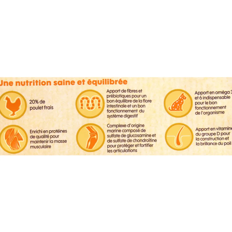 Protéines déshydratées de volaille 26.50% , poulet frais 20%, amidon de pomme de terre, fécule de manioc, graisse de volaille, levures, hydrolysat de protéines animales*, graines de lin extrudées 2%, protéines de pomme de terre, fèveroles extrudées, inuline 1% (source de FOS), huile de poisson 0.50%, carbonate de calcium, phosphate bi calcique, curcuma, L carnitine 230 mg/kg, sulfate de glucosamine 450 mg/kg, chondroïtine 450 mg/kg, ginseng indien (ashwaganda w somnifera), fleurs de camomille matricaire, feuilles de marjolaine, passiflore, racine de valériane, feuilles d’eucalyptus. (* composition exacte : foies de volaille, levure, chlorure de sodium). Constituants Analytiques :Protéines Brutes 31 %Matières Grasses Brutes 17 %Cellulose Brute 3 %Cendres Brutes 6 %Calories (d’après NRC 2006) 380 kcal EM/100grRPC g/1000 kcal 78Ca 0.90% P 0.80% Ca/P= 1.12 oméga 3 1% oméga 6 2.40% ω6/ω3=2.4