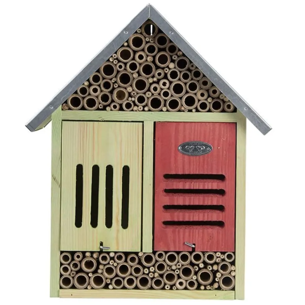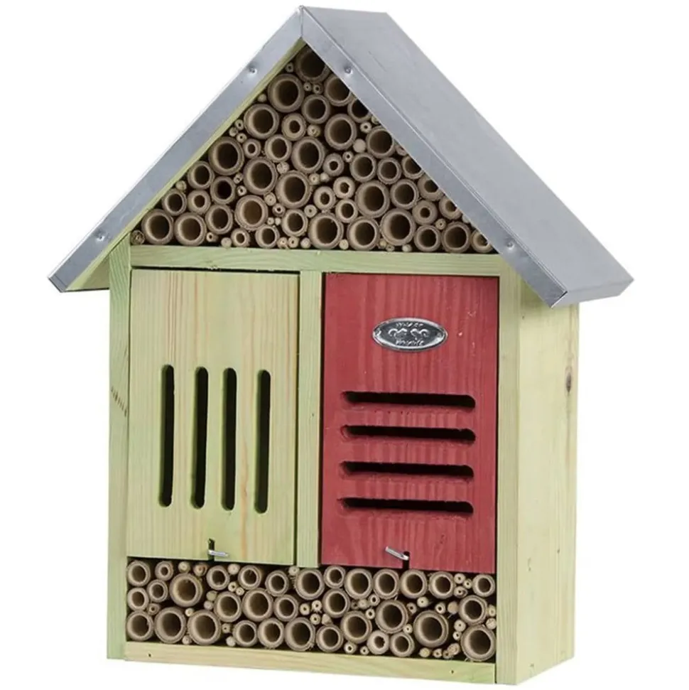 Offrez aux insectes de votre jardin un endroit unique pour s’installer avec ce très grand hôtel à insectes de la marque Esschert Design ! La maison à insectes est fabriquée en bois d’épinette, bambou et zinc, ce qui en fait un endroit approprié et parfait pour les abeilles, les papillons et les coccinelles. Le compartiment rouge en bas permet la protection et le logement des chrysopes vertes, des coccinelles et des perce-oreilles. Les insectes pollinisent les plantes et agissent comme des contrôleurs naturels des ravageurs. Grâce à l’hôtel à insectes, vous pouvez les offrir la possibilité de nicher et d’hiberner. Chacun préfère un diamètre différent, il est donc parfait pour eux. Remarque: il est recommandé de nettoyer les pailles en bambou avec la brosse incluse avant d’accrocher l’hôtel à insectes.