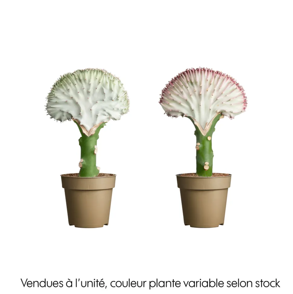 L’Euphorbia lactea est un arbuste succulent de la famille des euphorbes (Euphorbiaceae). L’espèce est originaire de l’île du Sri Lanka et est un arbuste à croissance verticale qui peut atteindre une hauteur de 5 mètres à l’état sauvage. L’Euphorbia Lactea pousse dans un port droit avec de nombreuses branches anguleuses ramifiées en candélabre, vert clair aux marbrures blanches en leur centre, pour cette raison qu’on le nomme également ‘cactus de lait’ ou également « os de dragon’. Floraison possible, dans la nature (plus rare en pot), avec de petites fleurs jaunes groupées sur les branches terminales. Cette plante candélabre est gracieusement simple et élégante, facile d’entretien. Idéal pour les personnes qui ne sont pas souvent à la maison et qui veulent quand même avoir une plante unique avec une belle apparence devant la fenêtre.