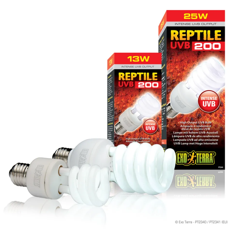 L?ampoule fluocompacte UVB200 Exo Terra pour reptiles émet le spectre idéal de rayons UVB pour une photosynthèse optimale de la vitamine D3. Elle est spécialement conçue afin de simuler, pour les reptiles, des conditions avec rayons UV très élevés, comme dans les climats désertiques. Dans le désert, la lumière du soleil est directe et non filtrée, avec un taux élevé de rayons UVB. Grâce à sa distance de pénétration augmentée, cette ampoule est idéale pour les terrariums hauts ou avec couvercle au grillage serré.