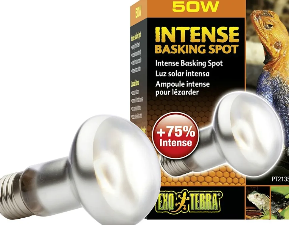 La chaleur et la lumière du faisceau sont augmentées de 35 %, permettant une plus grande distance entre l’ampoule et le site pour lézarder. Les rayons U.V.A. (ultraviolets A) contribuent au bien-être physiologique des reptiles