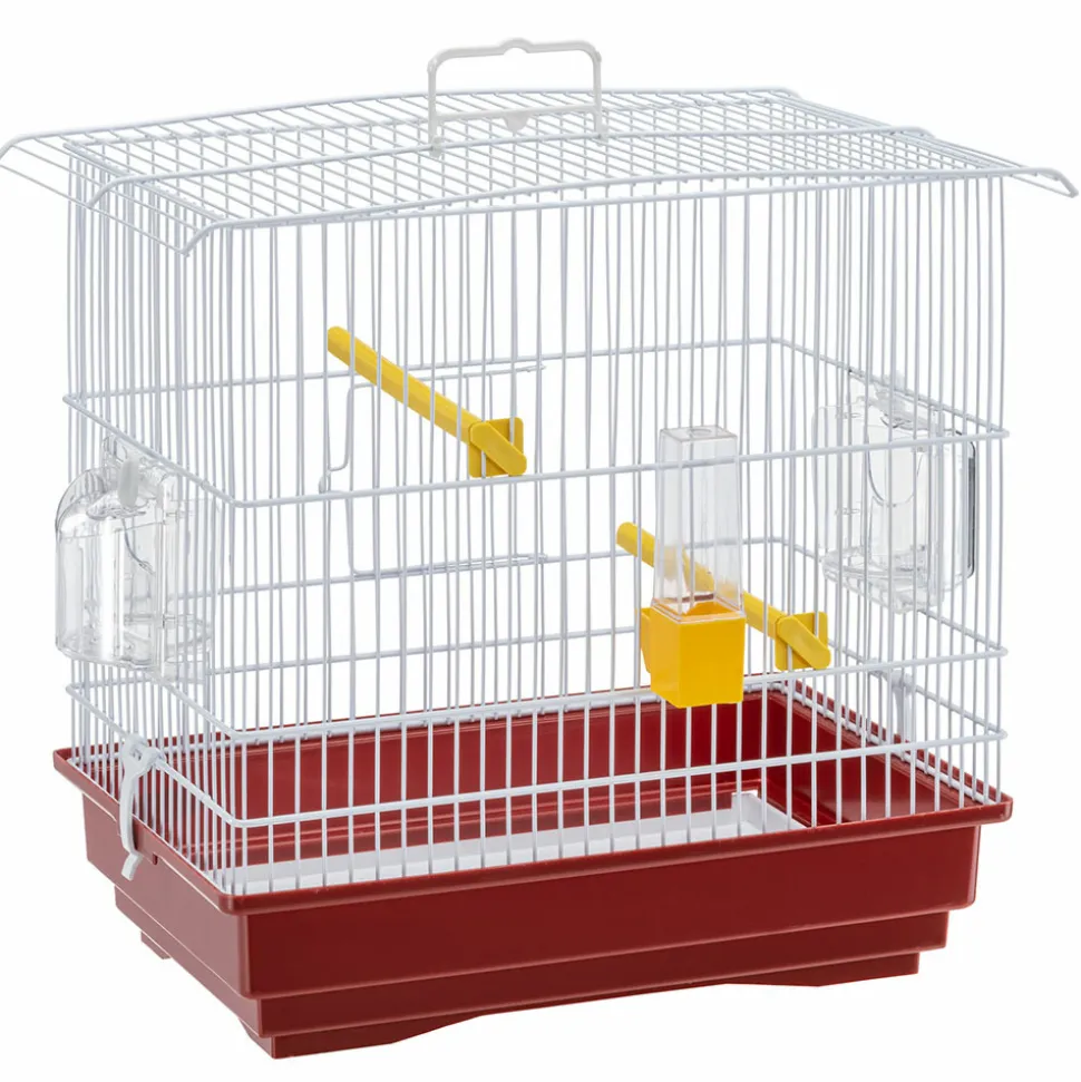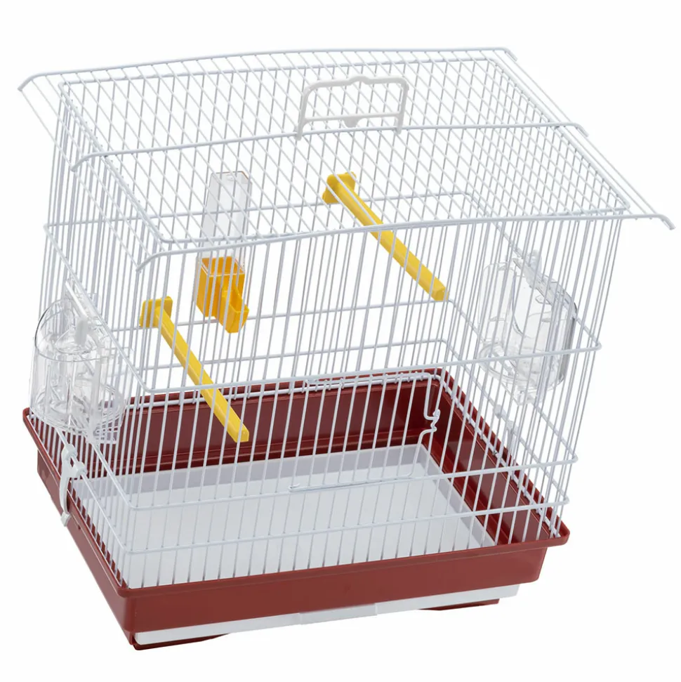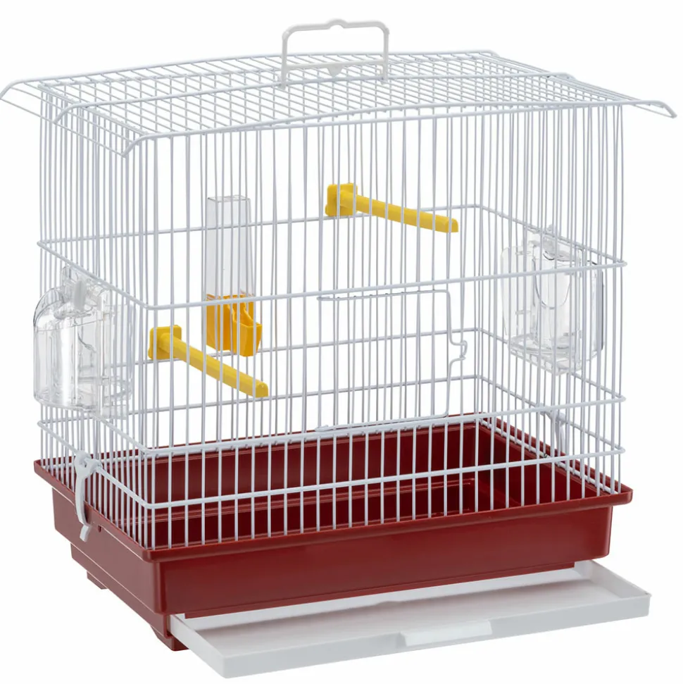 Cage pour canaris et petits oiseaux exotiques livrée avec accessoires : perchoir, abreuvoir et mangeoire. Barreaux métalliques et fond en plastique. Facilité d’entretien et de nettoyage grâce au plateau coulissant. Le support en plastique est disponible en accessoire.