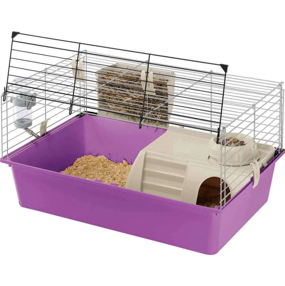Cochons d’Inde, hamsters et autres petits rongeurs vont adopter sans hésiter cette grande cage tout confort. Le grillage est en fer gris et orange et le bac en plastique peut être gris foncé, gris clair ou bleu. À l’intérieur, une maisonnette, un abreuvoir, une mangeoire et un râtelier pour le foin et la paille. Le toit s’ouvre de façon à pouvoir câliner facilement votre petit protégé et lui nettoyer son espace sans contrainte. L70xl47xh37.5cm.